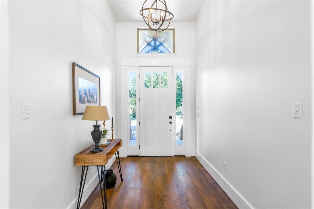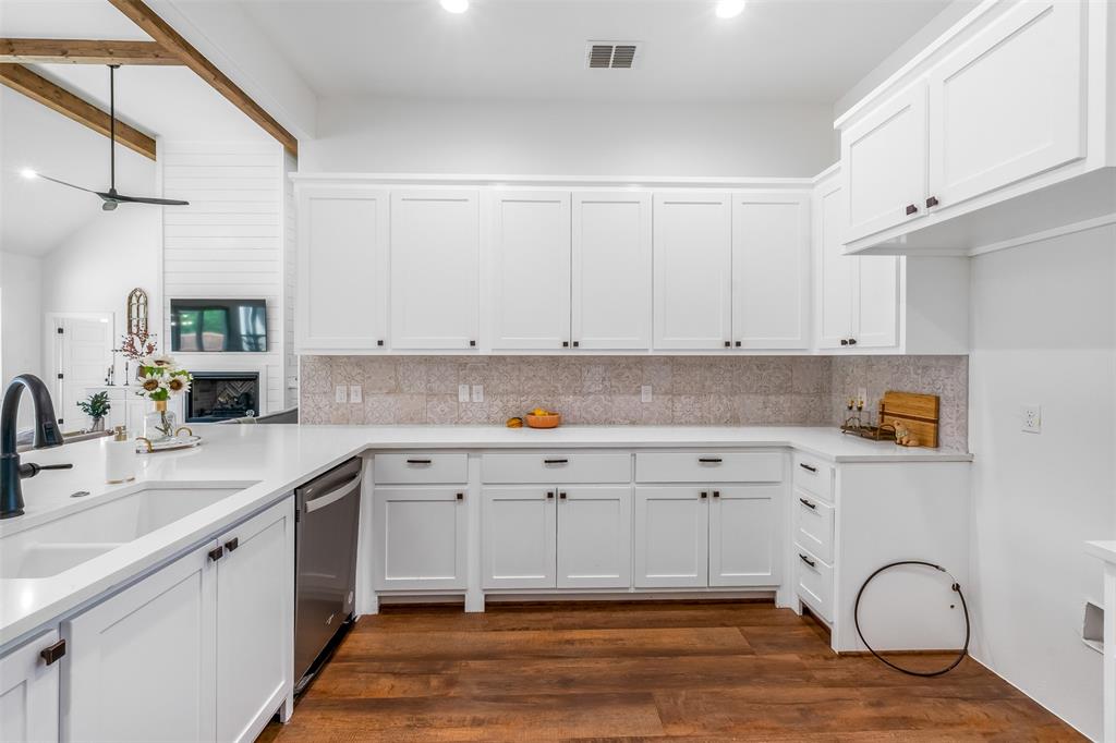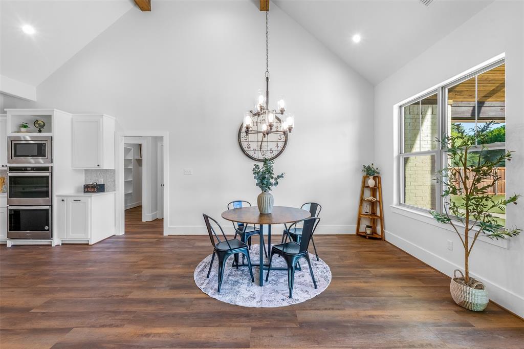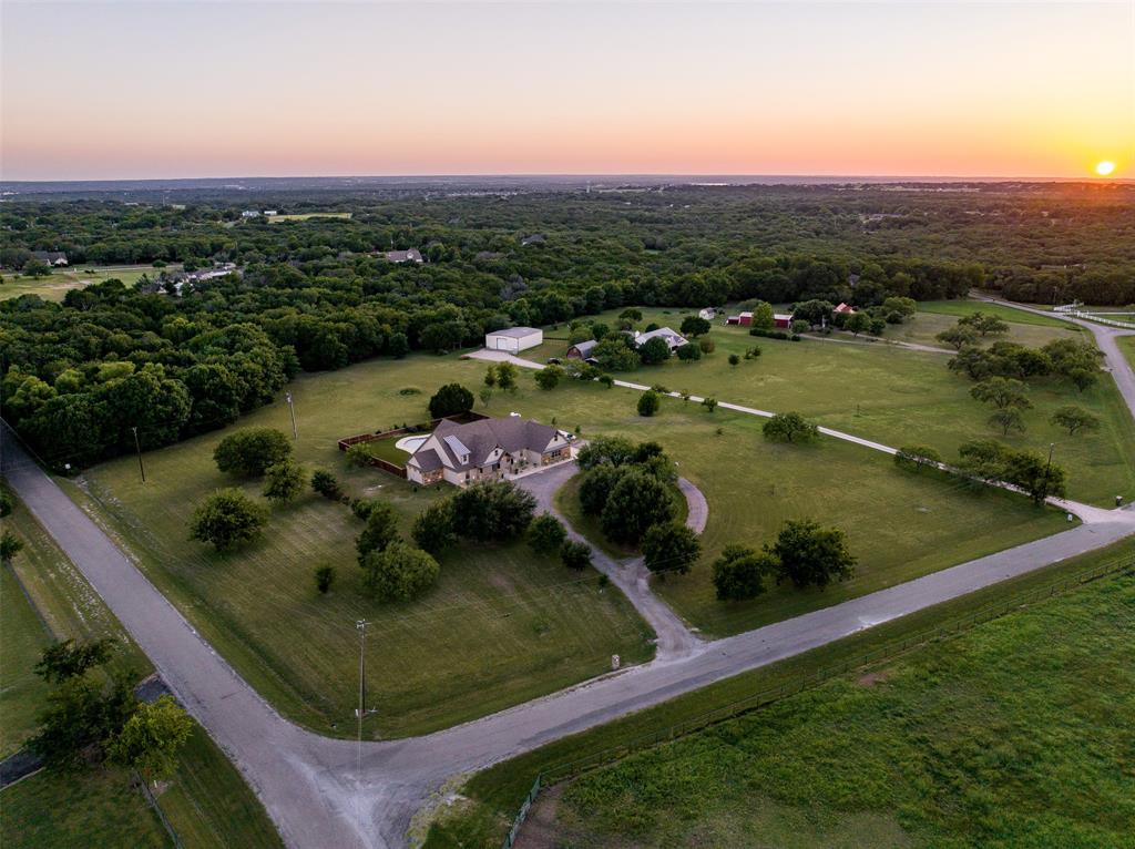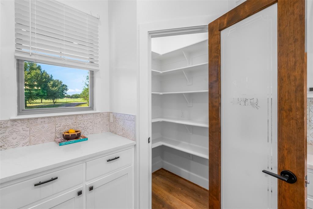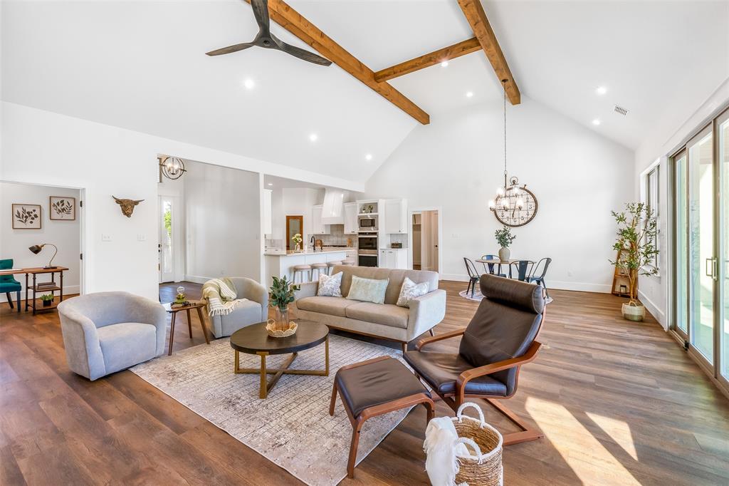 This home has it all! This 2021 high-end build is situated on five peaceful acres and backs up to a wooded creek, yet it is located just minutes from shopping and restaurants. The show stopping living room features a vaulted ceiling with decorative wooden beams, a floor to ceiling shiplap fireplace and double glass doors leading to the pool area. Functionality meets luxurious design in the kitchen with quartz counters, designer tile backsplash, built-in appliances and ample counter space.