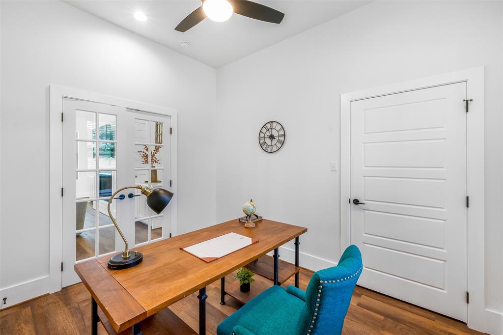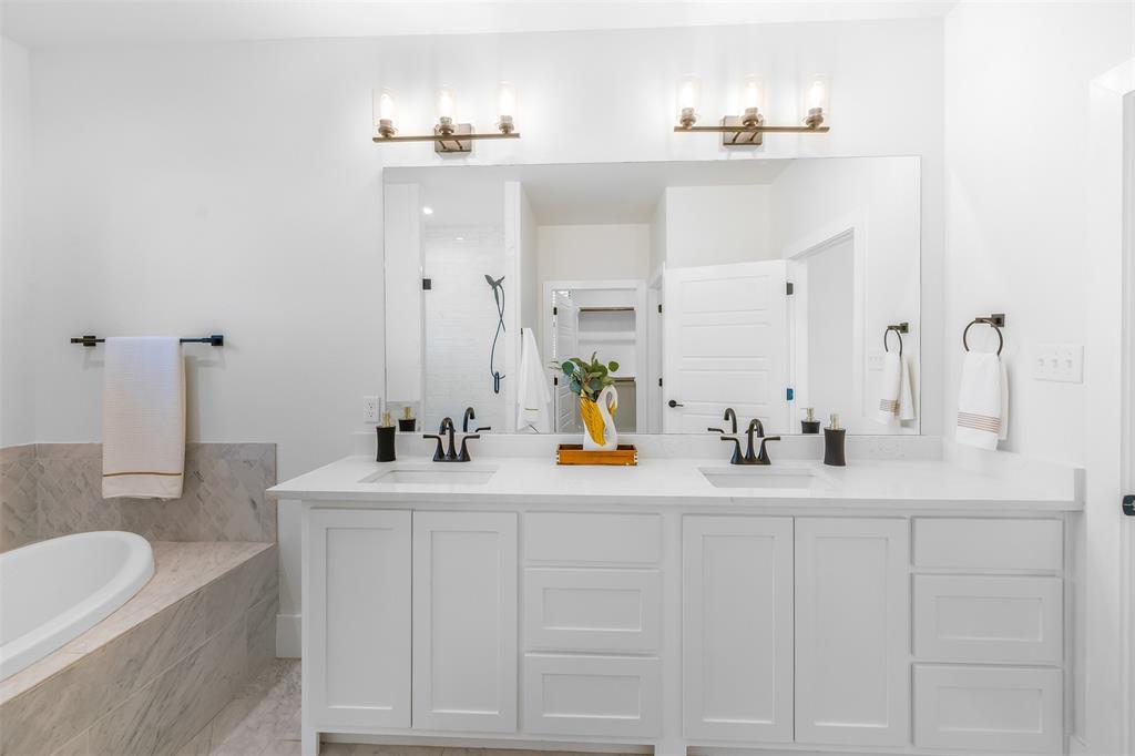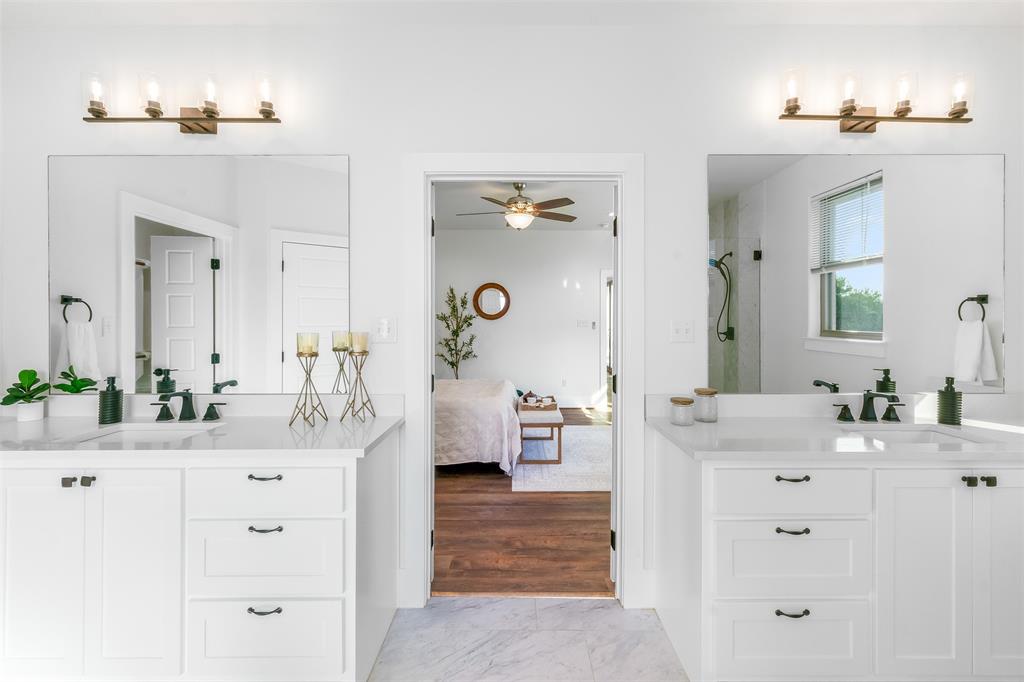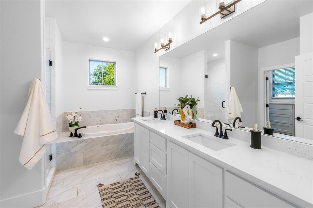 The primary bedroom overlooks the pool area and leads to the en-suite bathroom with separate vanities, jetted tub, walk in shower and large walk in closet. Across the house, the SECOND PRIMARY BEDROOM also has an en-suite bathroom with double sinks, walk in shower, large bathtub and custom walk in closet. Glass French doors off the living room lead to the office, perfect for working remotely! Oversized laundry room has decorative tile floors and is lined with cabinetry for extra storage. You won't lack storage in the large walk in closet off the hallway.