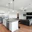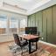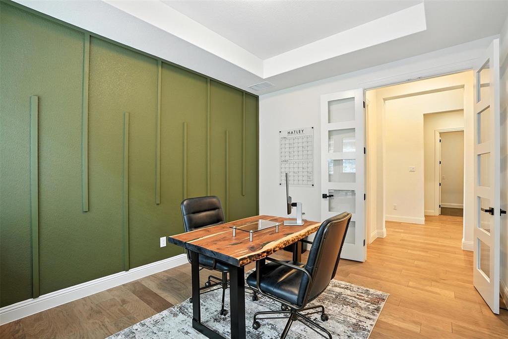 The kitchen features quartz countertops, stainless steel appliances, designer tile backsplash, ample cabinetry, and a spacious walk-in pantry — all open to the dining and living areas for seamless entertaining. Glass French doors enclose the private office, while a dedicated media room provides the perfect space for movie nights or game-day hosting.