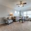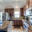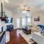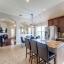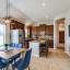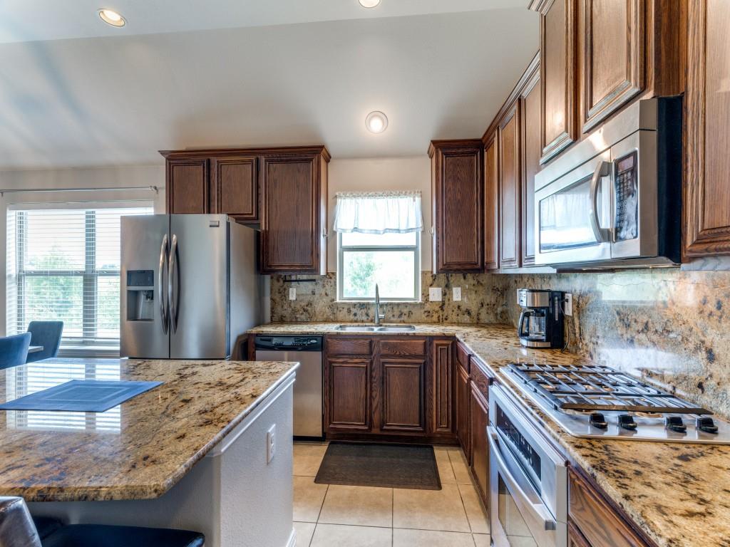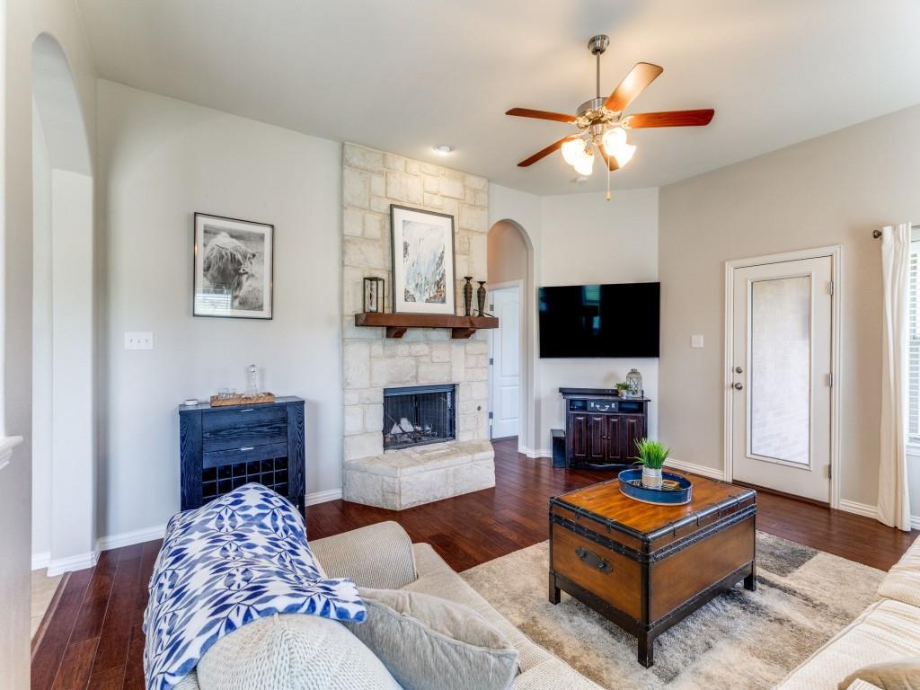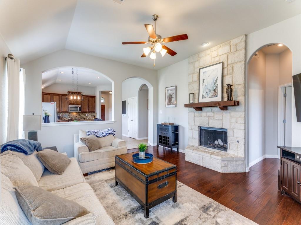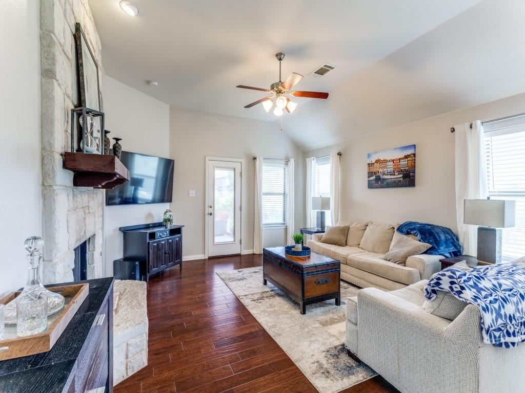 The well-appointed kitchen features granite countertops, stainless steel appliances, gas cooktop, and a center island with breakfast bar seating—ideal for everyday living or entertaining. The open-concept layout flows into a cozy living room with a stunning stone fireplace and wood flooring, creating a warm and inviting atmosphere.