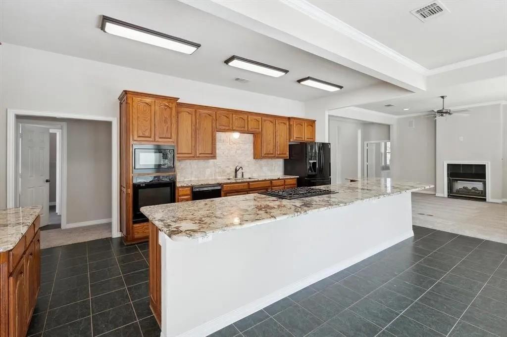 A gated drive leads to an irrigated Bermuda lawn and a stone walkway to the covered front porch. Inside, an open floor plan features a spacious living area with a gas fireplace, seamlessly connecting to the dining area, gourmet kitchen, and billiards room—perfect for entertaining. The three oversized bedrooms provide ample space, with the master suite boasting a large bathroom and walk-in closet.
