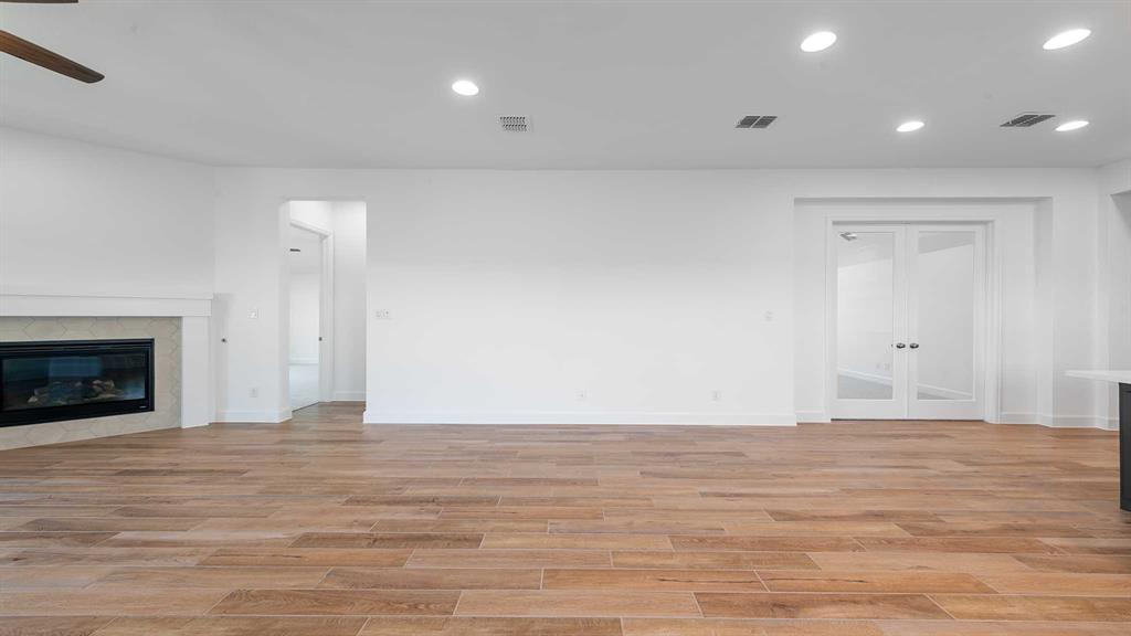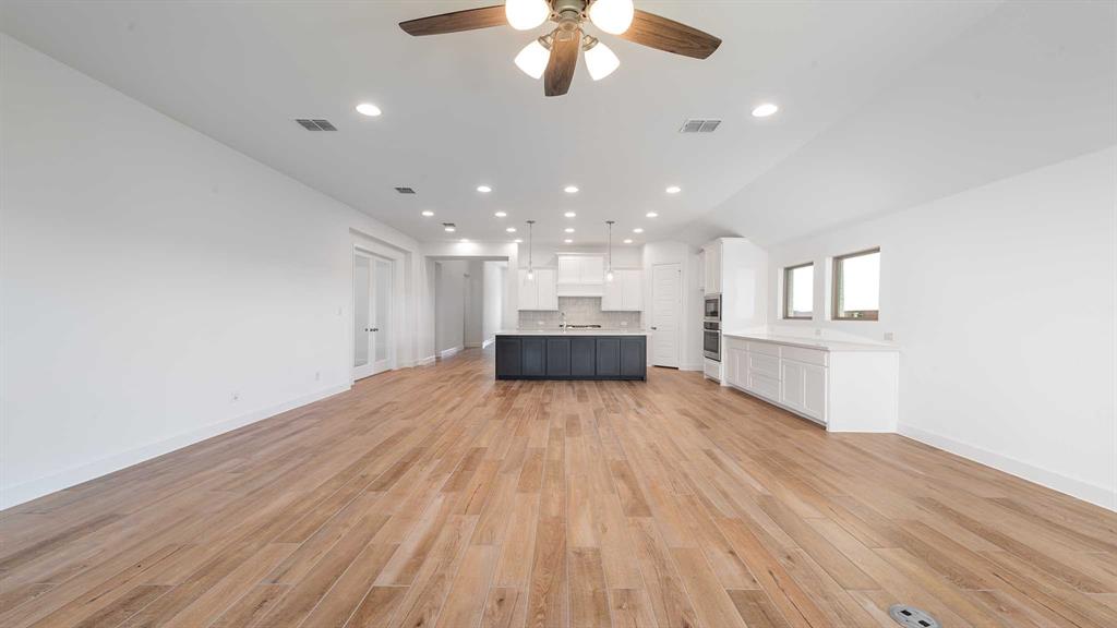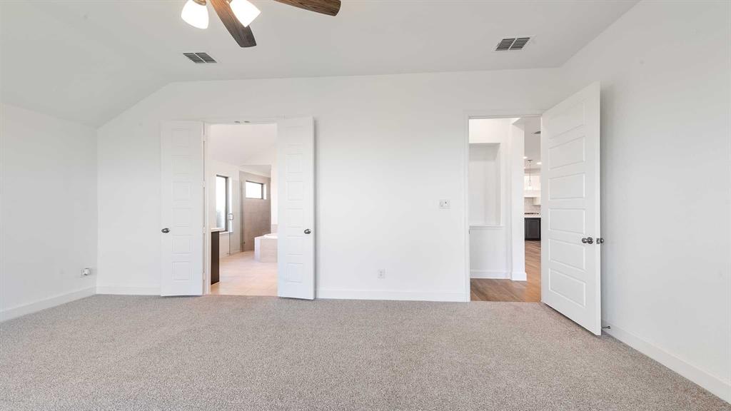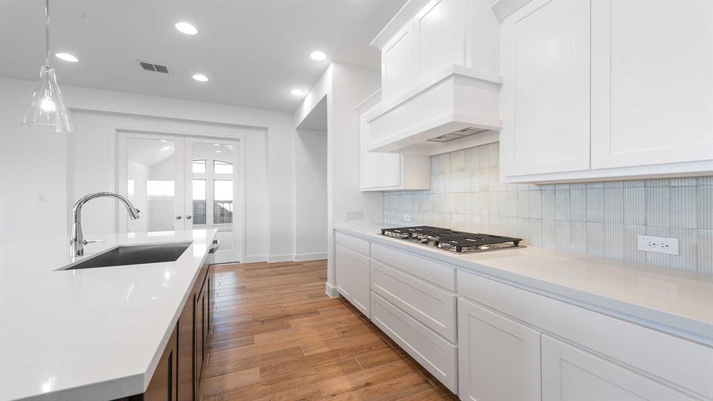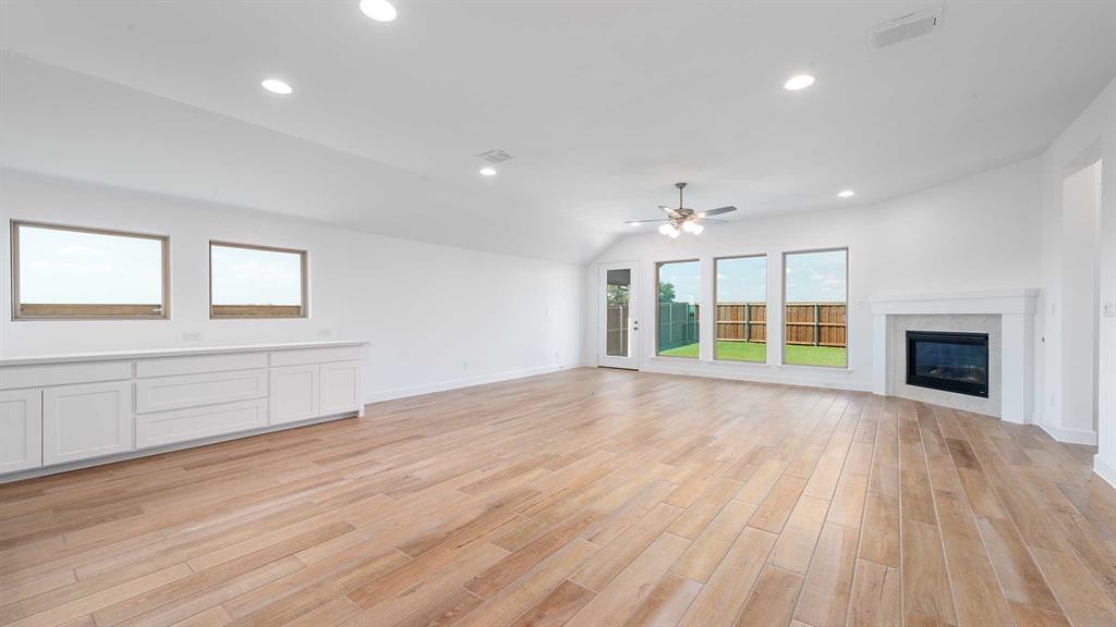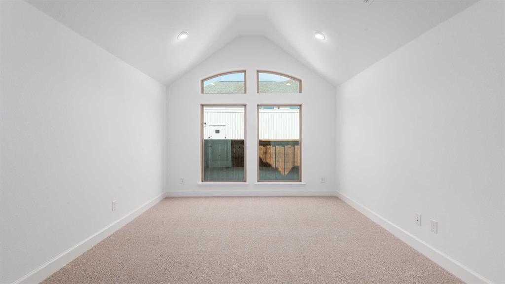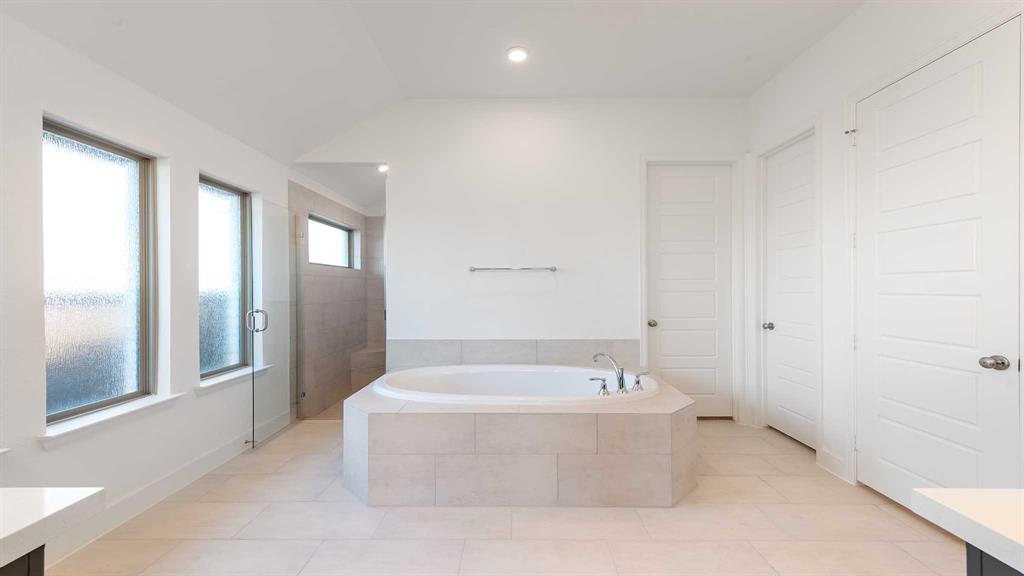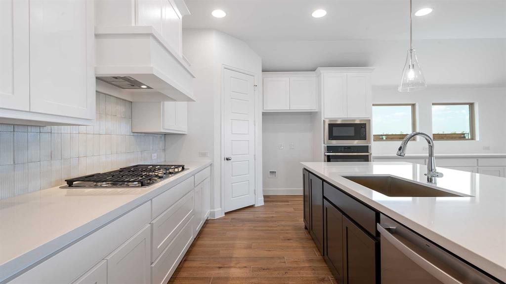 Extended entry with 13-foot ceiling leads to open kitchen, dining area and family room. Kitchen offers generous counter space, 5-burner gas cooktop, corner walk-in pantry and inviting island with built-in seating space. Dining area flows into family room with a wood mantel fireplace and wall of windows. Game room with French doors just across from kitchen. Primary suite includes double-door entry to primary bath with dual vanities, garden tub, separate glass-enclosed shower and two large walk-in closets. Secondary bedrooms feature walk-in closets. Covered backyard patio. Mud room off two-car garage.