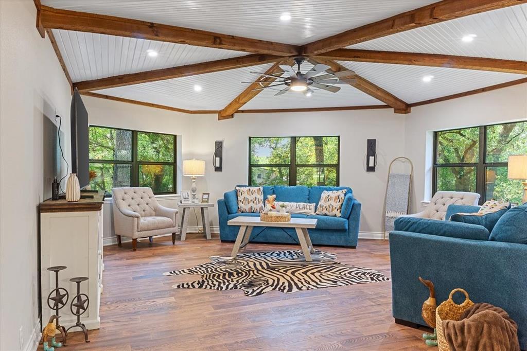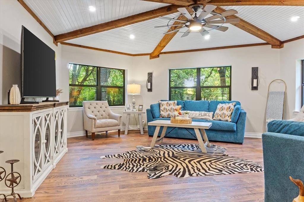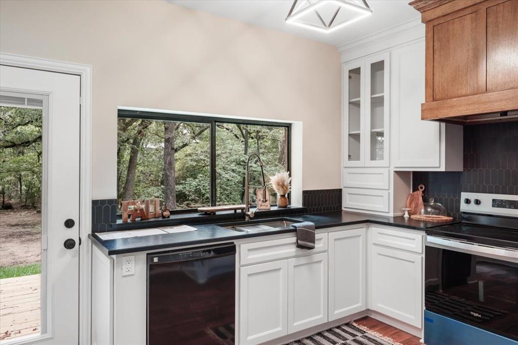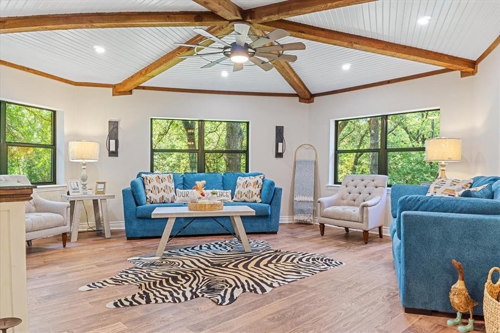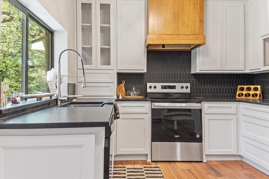 Inside, you’ll find rich hardwood floors and a striking wood-accented ceiling in the living room, creating warmth and character throughout. The thoughtful floor plan includes a spacious Jack-and-Jill bathroom between the secondary bedrooms and a beautifully updated master suite designed for both comfort and style. The kitchen features a convenient serving window that opens to the large back deck — ideal for entertaining or enjoying peaceful evenings outdoors. Additional highlights include a 2-car garage with ample storage and a private office space that makes working from home easy and efficient. With its charm, functionality, and serene setting, this home is truly one of a kind!