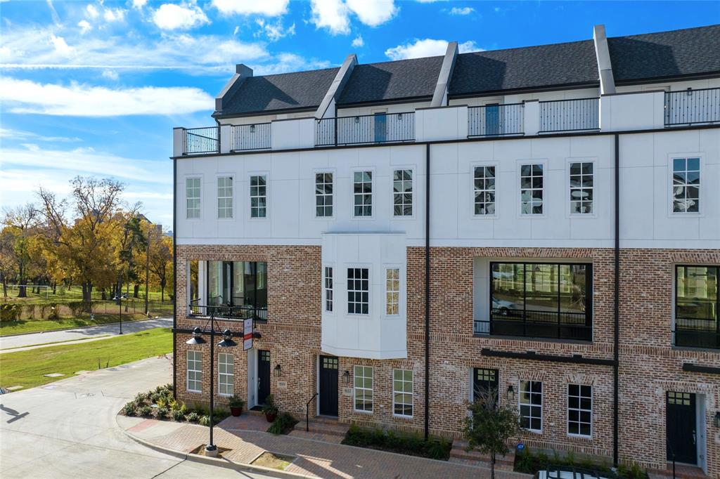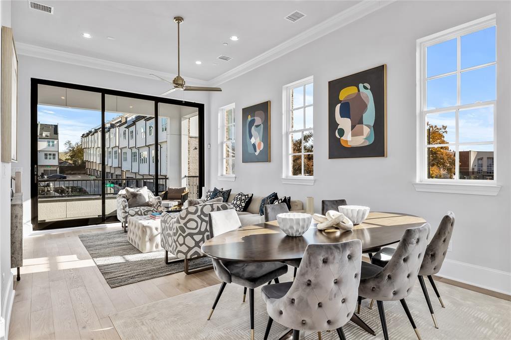 Coveted Community Model Home NOW AVAILABLE for Purchase! This stunning, move-in-ready end unit is the current model home at Cedar Branch by InTown Homes. Ideally located just minutes from Oak Lawn and the Medical District, this sophisticated 3-bedroom, 3.5-bath home showcases premium designer finishes and thoughtful upgrades throughout. On the main level, enjoy soaring 12-foot ceilings, elegant 5-piece crown molding, and a dramatic 10-foot sliding glass panel leading to a private balcony—perfect for indoor-outdoor entertaining. The gourmet kitchen features Bosch stainless steel appliances, quartz countertops, upgraded stacked Eclipse cabinetry, a stylish tile backsplash, and an included refrigerator and wine refrigerator. The expansive primary suite offers a spa-inspired bath, complete with a large drop-in tub, a semi-frameless glass shower enclosure with floor-to-ceiling tile, and an oversized walk-in closet. Two additional bedrooms each offer en suite bathrooms with shower tile extending to the ceilings. Additional upgrades include engineered hardwood flooring throughout, epoxy paint finish on the garage floor, and roller shades on all windows. A spacious rooftop terrace delivers stunning views and an ideal setting for outdoor entertaining.