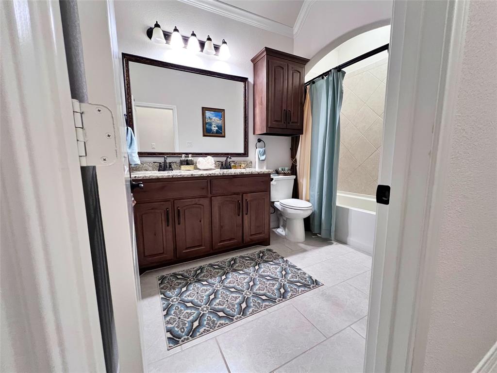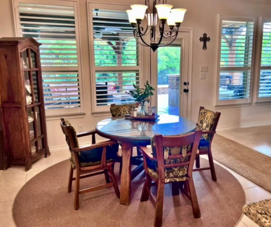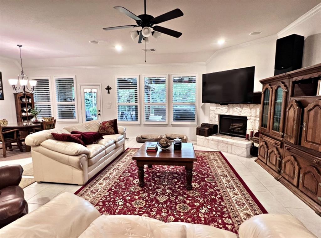 Inside, the home features a flexible, open-concept layout with a dedicated office and a formal dining area. The kitchen showcases upgraded cabinets and premium hardware pulls. Granite countertops, built-in appliances, complete with a functional Butler's Pantry and a large walk-in Pantry. Kitchen opens to a large family room with built-in surround sound speakers, its focal point a stone fireplace with a finished hardwood mantel. Ceramic tile flooring runs throughout (no carpet!), and Split tilt shutters adding practical charm.