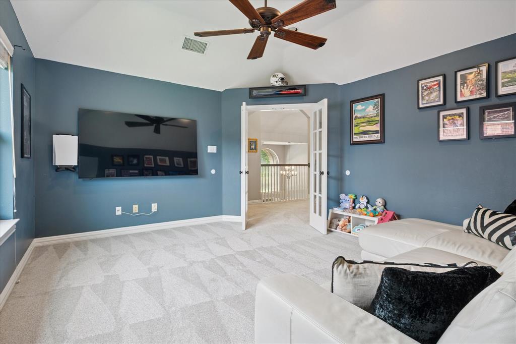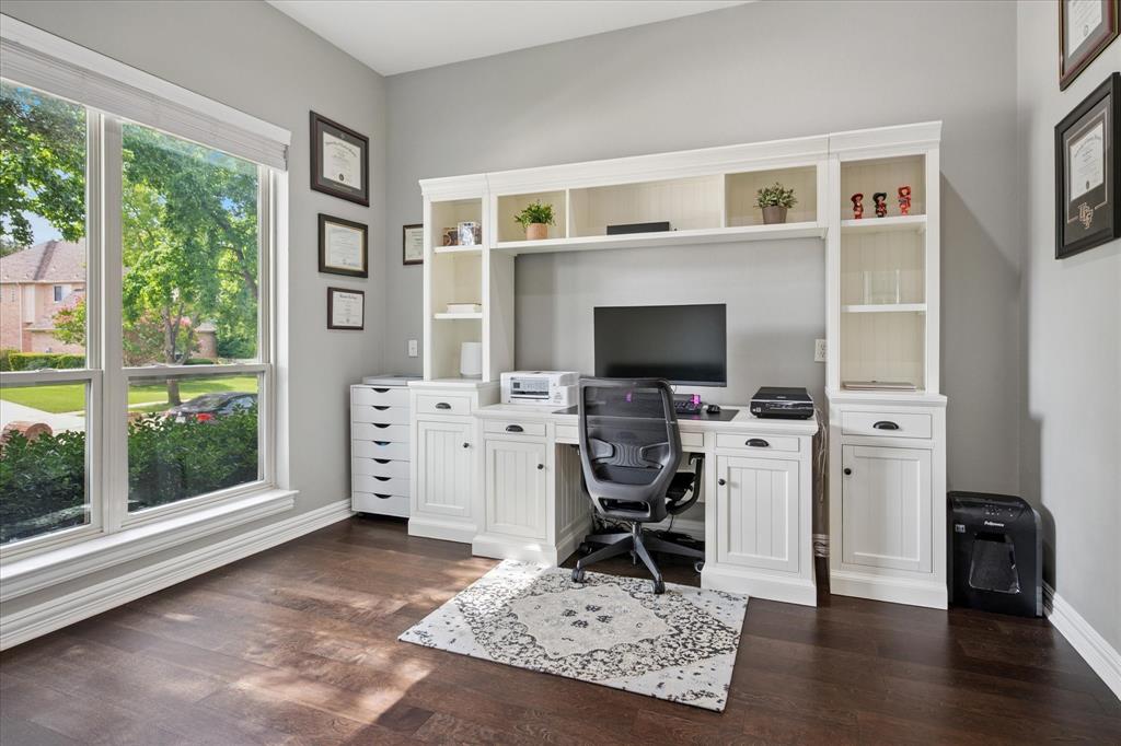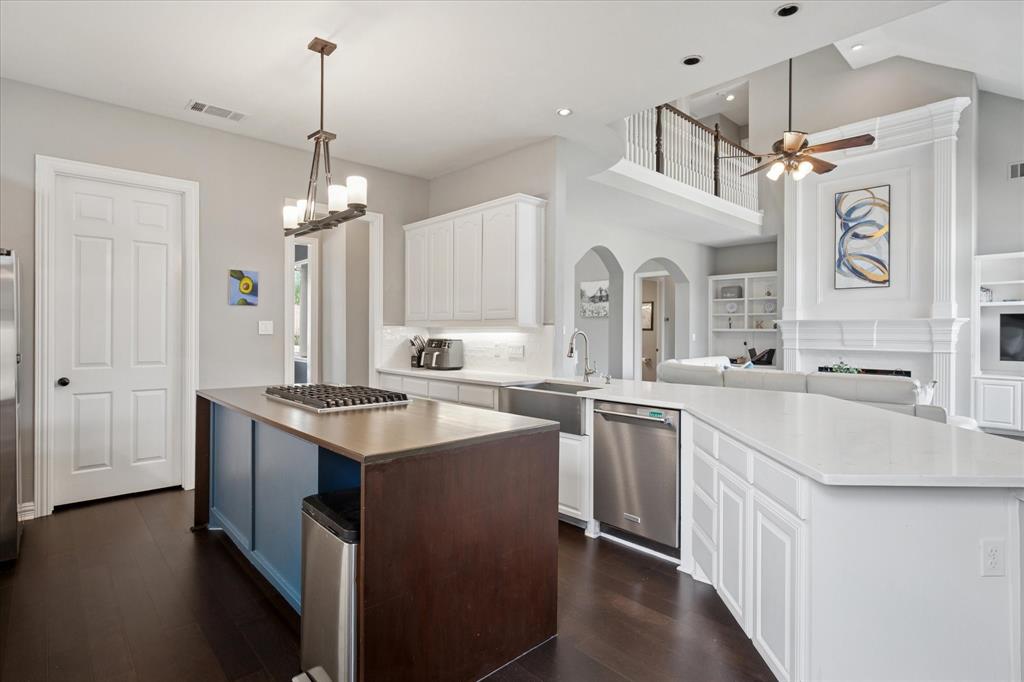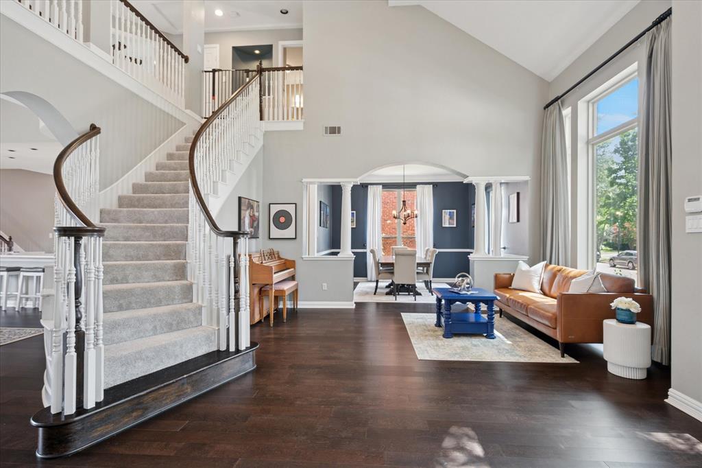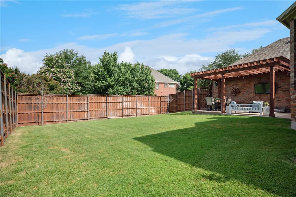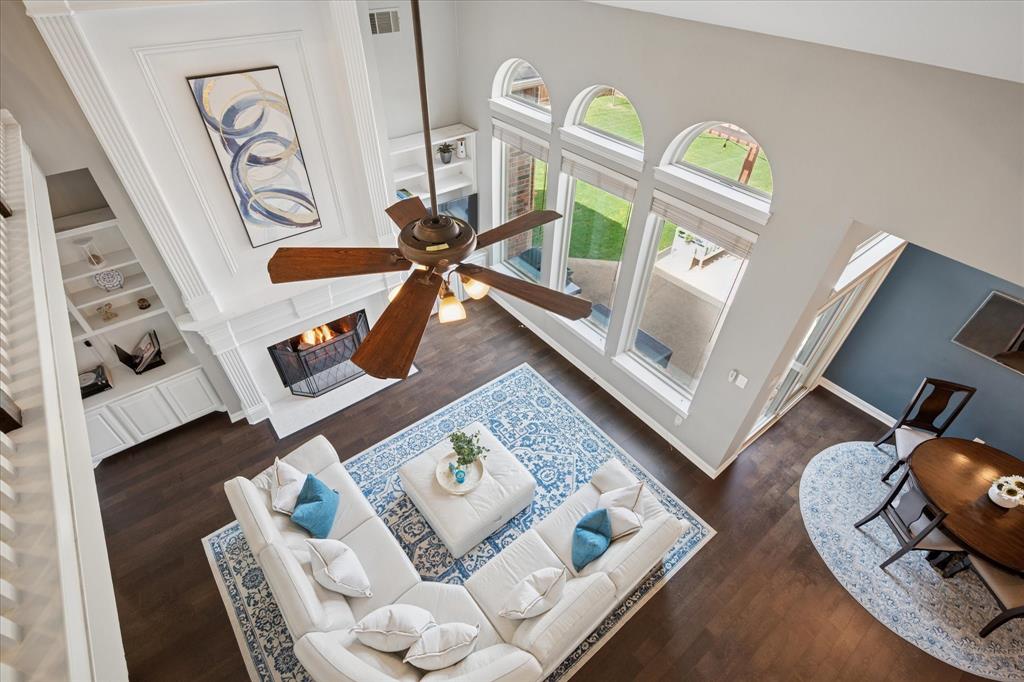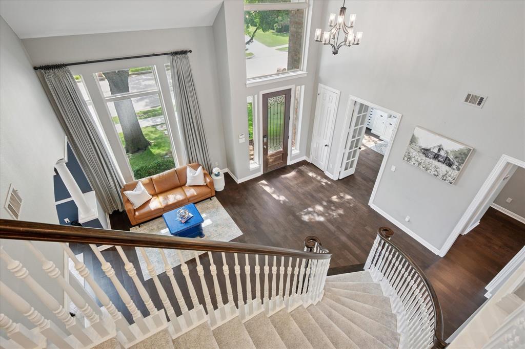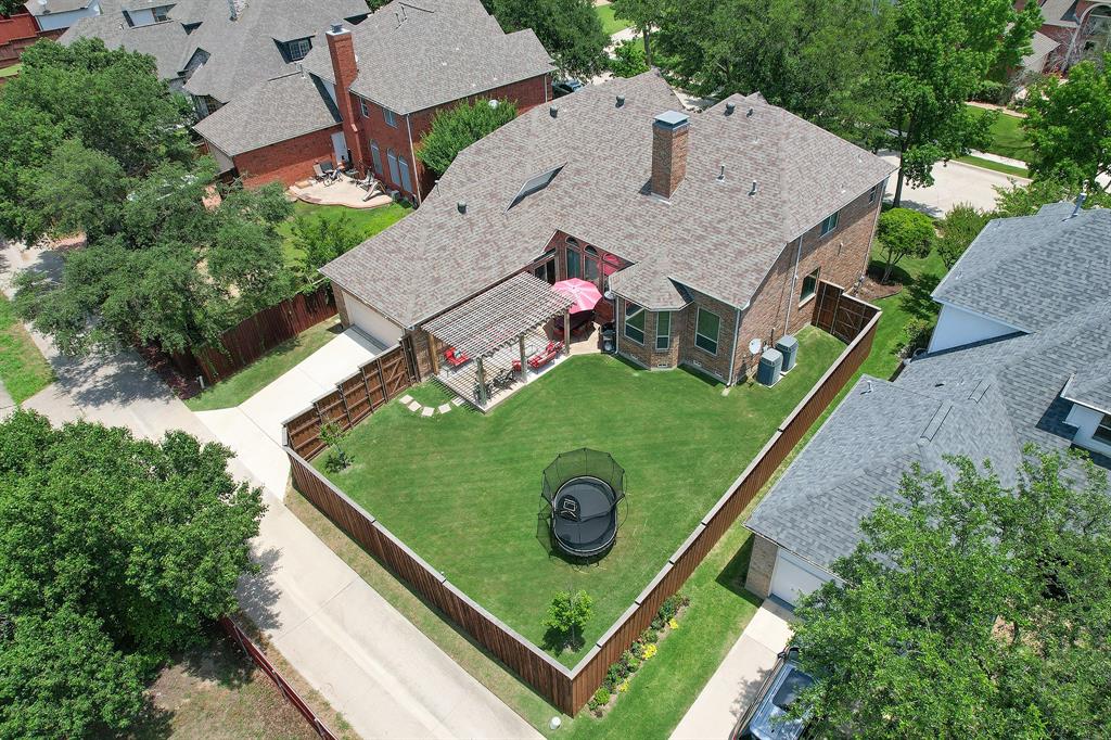 This thoughtfully renovated home offers a stylish blend of comfort and functionality, perfectly suited for today’s modern lifestyle. Located on an east-facing lot in the sought-after Hackberry Creek gated golf community, this property features recent updates and timeless finishes throughout. Step through the custom wood, glass, and iron entry door into a stunning two-story foyer with a sweeping staircase. Hardwood floors, designer lighting, and updated fixtures flow through spacious formal living and dining areas, along with a private study enclosed by French doors —ideal for working from home. The open-concept great room boasts large arched windows with backyard views, custom built-ins, and a gas fireplace with modern subway tile surround. The fully remodeled kitchen is a chef’s dream: quartz countertops, butcher block waterfall island, subway tile backsplash, stainless steel appliances, gas cooktop, breakfast bar, and ample storage. The main-level primary suite features a sitting area and a spa-inspired bath with a frameless glass shower and freestanding soaking tub. Upstairs, a second staircase leads to a versatile game room, three additional bedrooms, and two remodeled full baths — all providing flexible space for media, guests, hobbies, or daily life. Step outside to a large, fenced backyard with an extended patio and pergola perfect for gatherings or relaxation. Additional highlights include a 2-car rear-entry garage, epoxy garage floor, Elfa storage systems, recent carpet, custom drapes, and a hail-resistant roof. Move-in ready with elevated updates throughout, this home offers the space, location, and features to support a dynamic and comfortable lifestyle. *Upstairs HVAC and Electric panel replaced 2023!