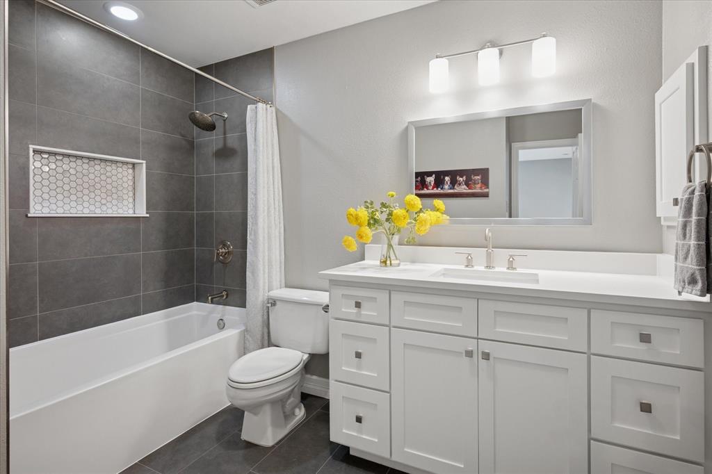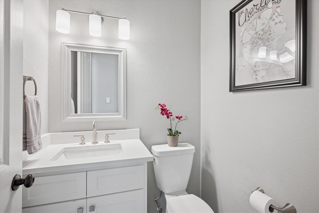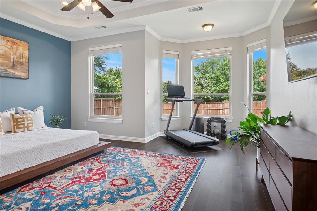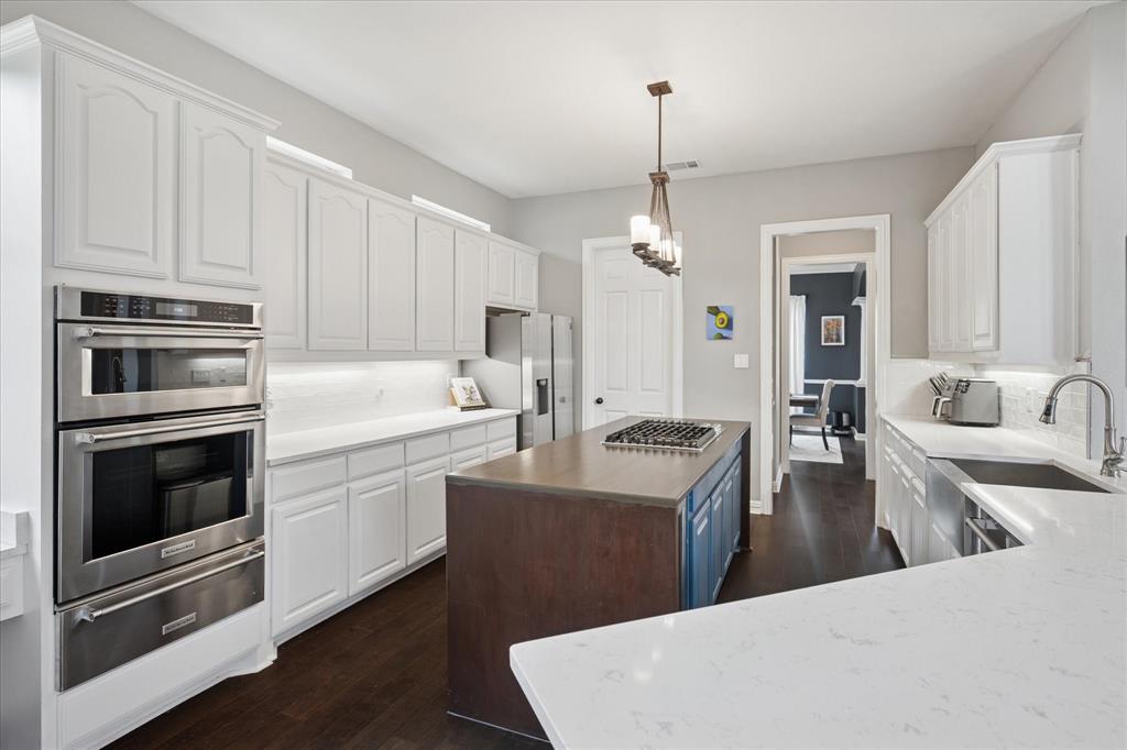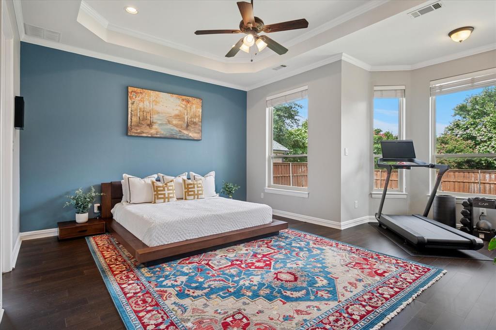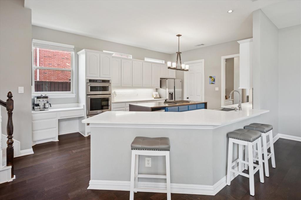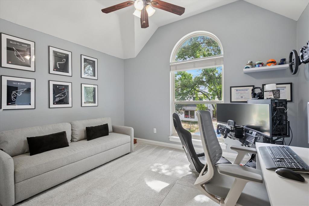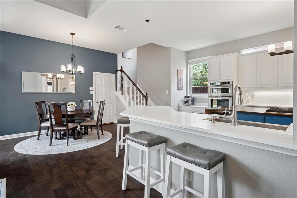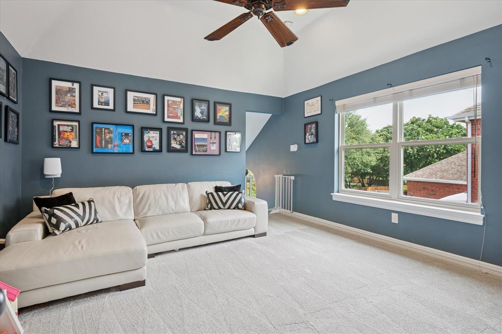This thoughtfully renovated home offers a stylish blend of comfort and functionality, perfectly suited for today’s modern lifestyle. Located on an east-facing lot in the sought-after Hackberry Creek gated golf community, this property features recent updates and timeless finishes throughout. Step through the custom wood, glass, and iron entry door into a stunning two-story foyer with a sweeping staircase. Hardwood floors, designer lighting, and updated fixtures flow through spacious formal living and dining areas, along with a private study enclosed by French doors —ideal for working from home. The open-concept great room boasts large arched windows with backyard views, custom built-ins, and a gas fireplace with modern subway tile surround. The fully remodeled kitchen is a chef’s dream: quartz countertops, butcher block waterfall island, subway tile backsplash, stainless steel appliances, gas cooktop, breakfast bar, and ample storage. The main-level primary suite features a sitting area and a spa-inspired bath with a frameless glass shower and freestanding soaking tub. Upstairs, a second staircase leads to a versatile game room, three additional bedrooms, and two remodeled full baths — all providing flexible space for media, guests, hobbies, or daily life. Step outside to a large, fenced backyard with an extended patio and pergola perfect for gatherings or relaxation. Additional highlights include a 2-car rear-entry garage, epoxy garage floor, Elfa storage systems, recent carpet, custom drapes, and a hail-resistant roof. Move-in ready with elevated updates throughout, this home offers the space, location, and features to support a dynamic and comfortable lifestyle. *Upstairs HVAC and Electric panel replaced 2023!