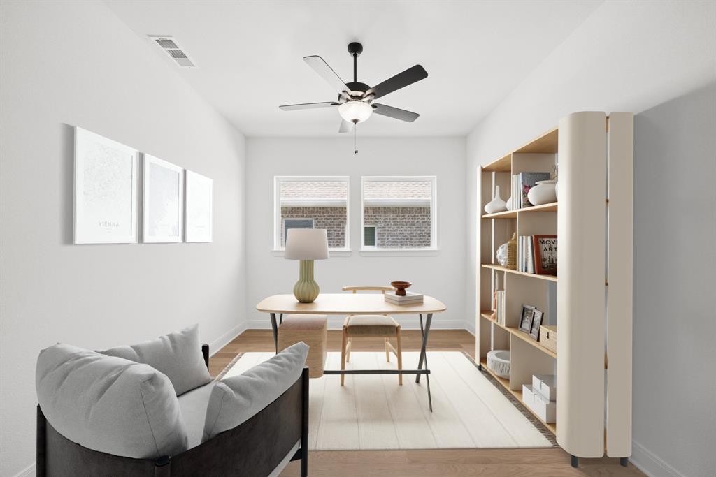 This stunning corner lot two story home, located in the award winning community of Pecan Square, offers spacious living with 2 bedrooms and 2.5 baths on the main level, including a dedicated study. The open concept design features soaring high ceilings and a dramatic open to below area, creating an airy and inviting atmosphere. Upstairs, you'll find 2 additional bedrooms, each with its own private bathroom, as well as a retreat area perfect for kids to play and unwind. The media room provides the ideal space for movie nights or entertainment. Located in a community with amenities galore, this home is perfect for modern living, relaxation, and family fun.