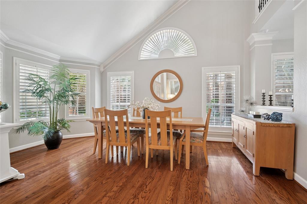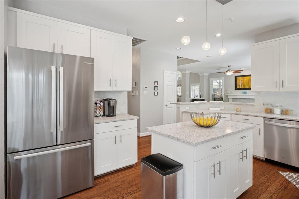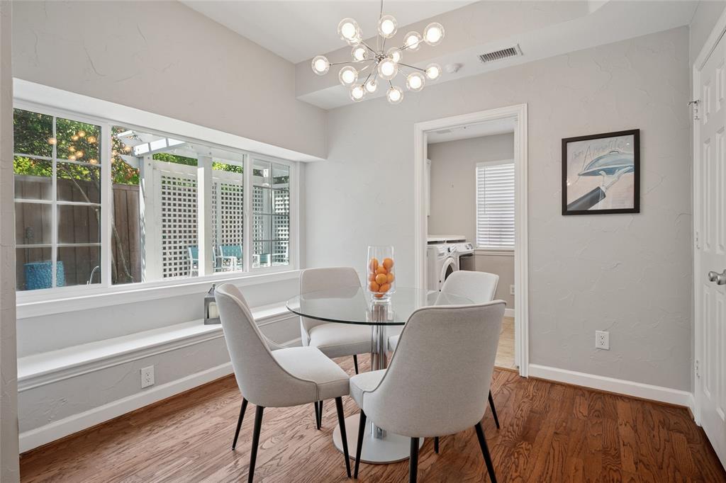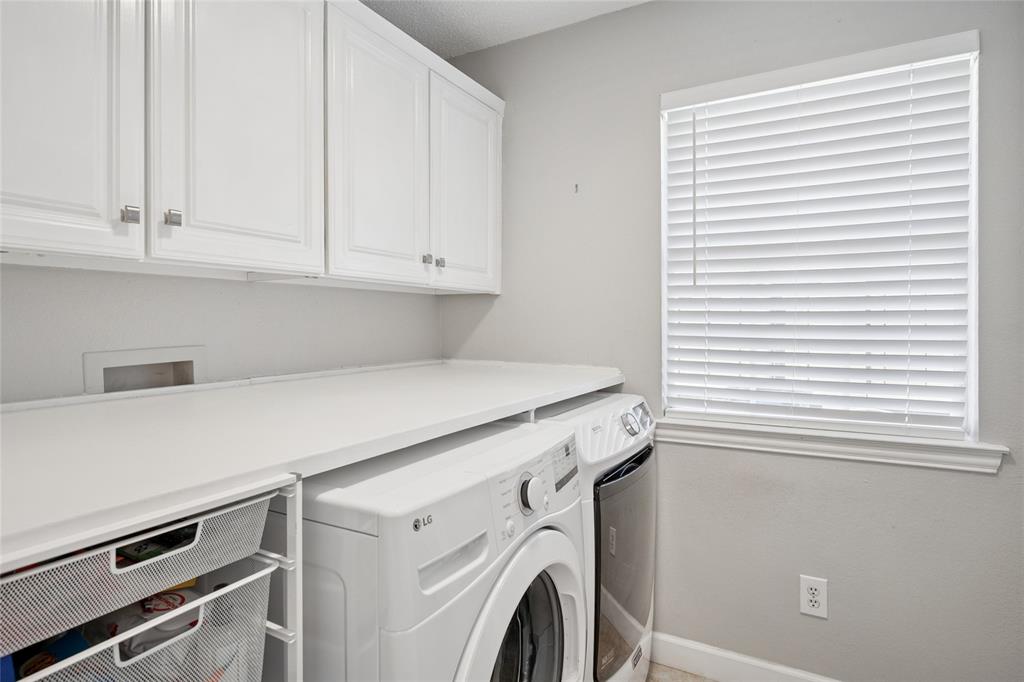 Adjacent breakfast area enjoys banquet seating under large window exposing the sunny, south-facing back patio. Also contains the second pantry closet. There is a designated room for Washer and dryer w storage and walk in pantry also on the first level.