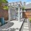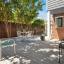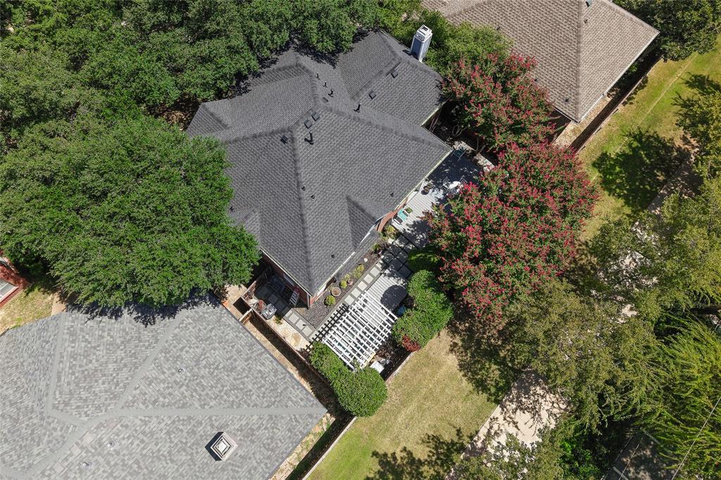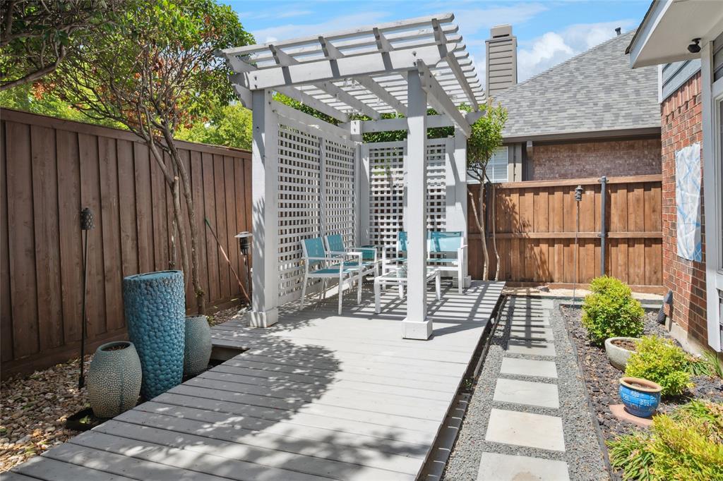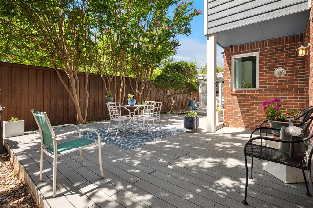 Backyard patio shaded by colorful, mature crepe myrtle trees, makes for delightful outdoor entertaining.