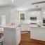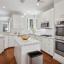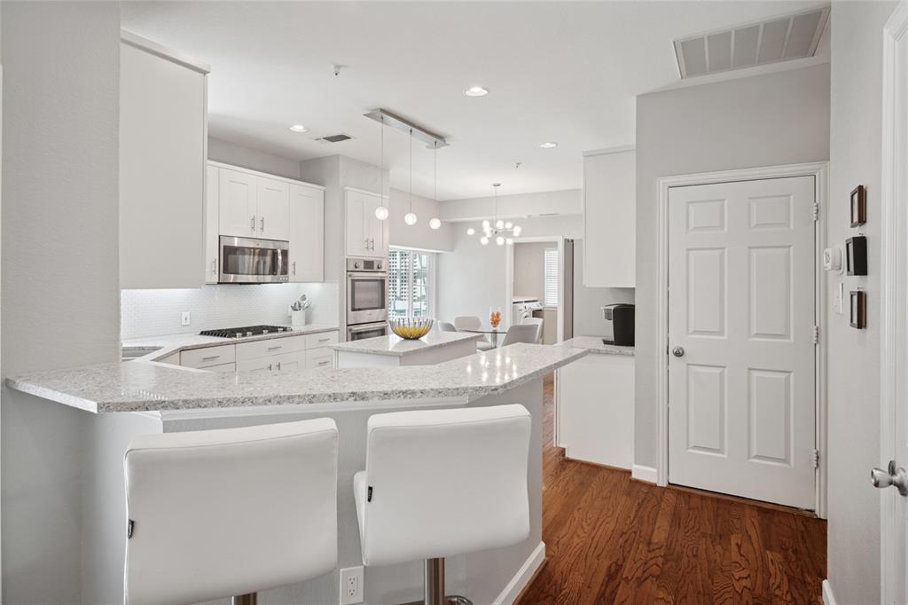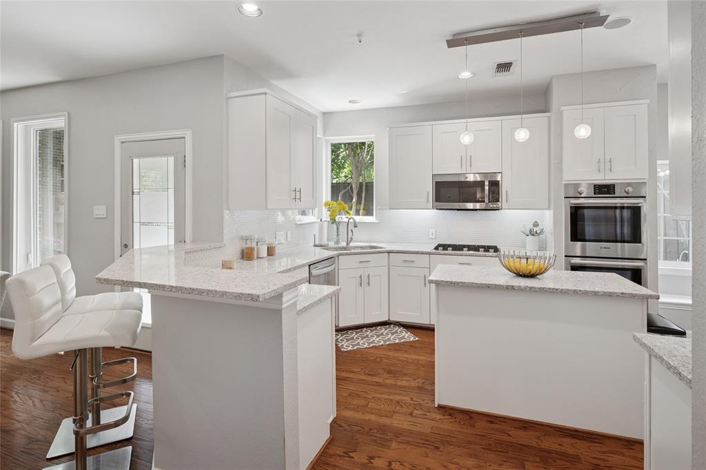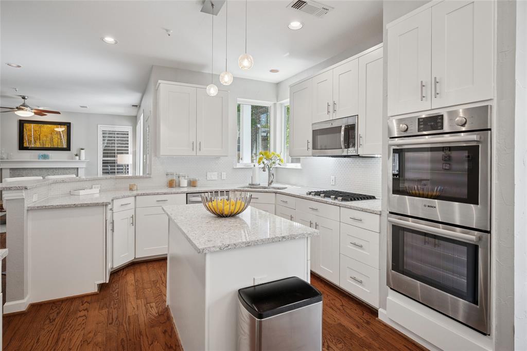Stylish kitchen boasts Cesar Quartz counters, under cabinet lighting, Jen-air gas cooktop and Bosch double ovens.
