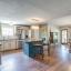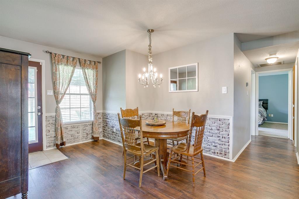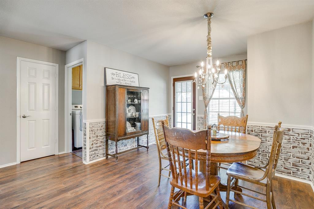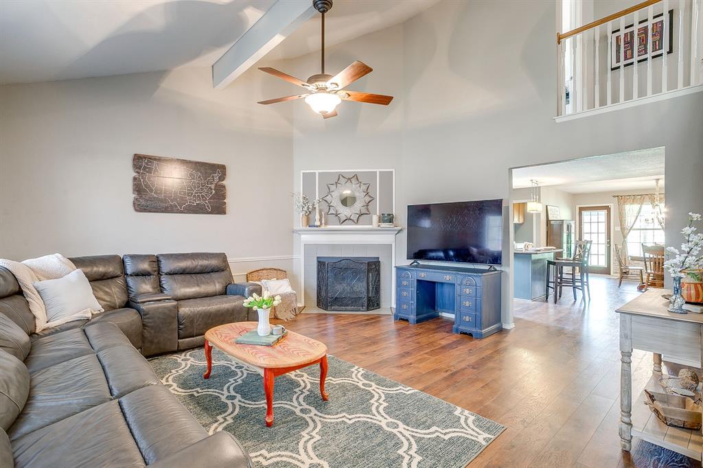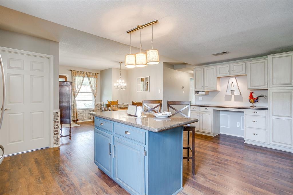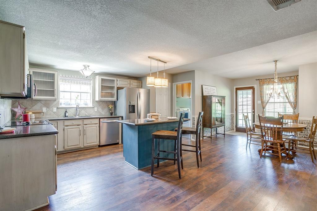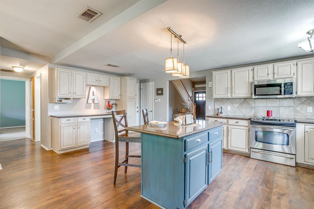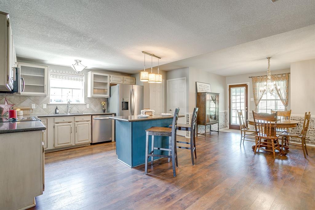 Step into the the spacious living room with its soaring vaulted ceiling, wood-like laminate flooring, and cozy wood-burning fireplace that offers a warm and welcoming place to relax or entertain. The oversized updated kitchen features quartz countertops, stainless steel appliances, dishwasher replaced 2025, a center island for prep and gathering, a built-in desk for homework or planning, and plenty of cabinetry. The lovely eat in boasts style and a bit of fun with faux brick wainscotting and a chandelier. Oversized utility room has cabinets, folding space, and metal looking tile.