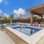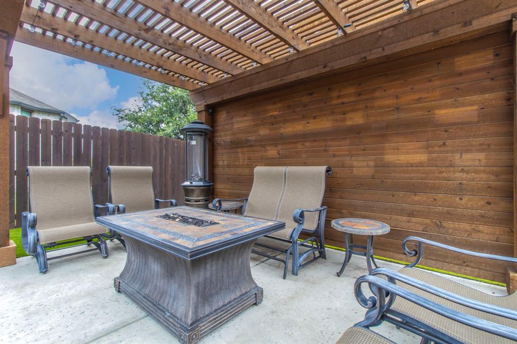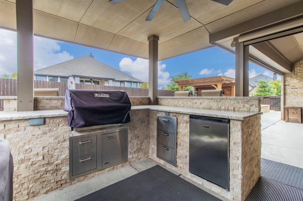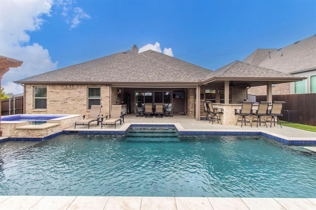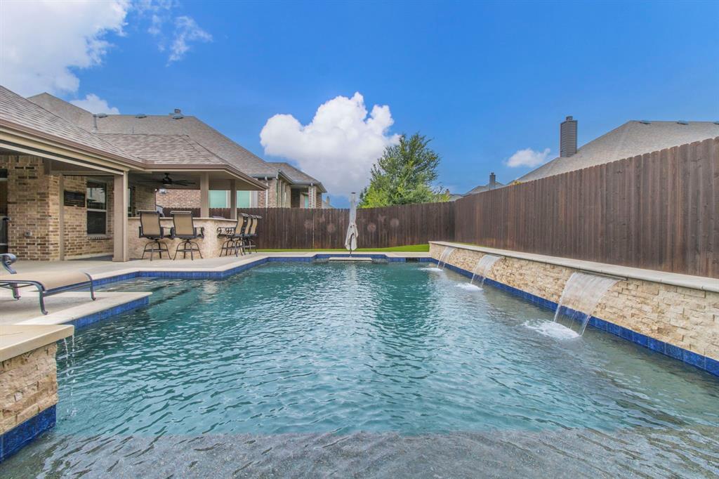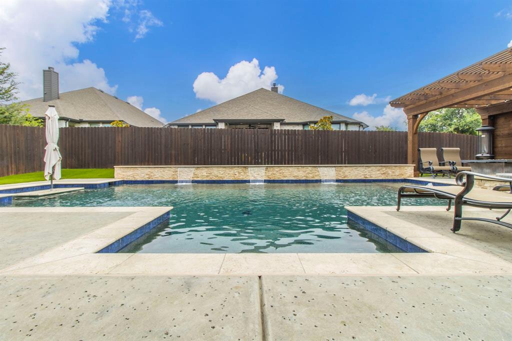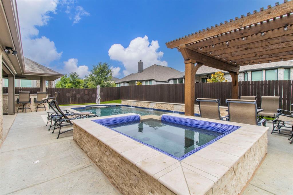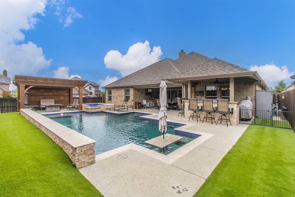 Step into your private backyard paradise featuring a stunning custom pool and spa with a tequila table, soothing waterfalls, and a sun shelf with bubbler. The outdoor living continues with a covered grilling area complete with granite counters, a Lion Premium gas grill connected to a direct gas line, a mini-fridge, and extra storage. A second covered patio with a pergola provides space to relax or entertain with shade and privacy. Low-maintenance artificial turf and a separate gated side yard offer a perfect setup for pets or play area.