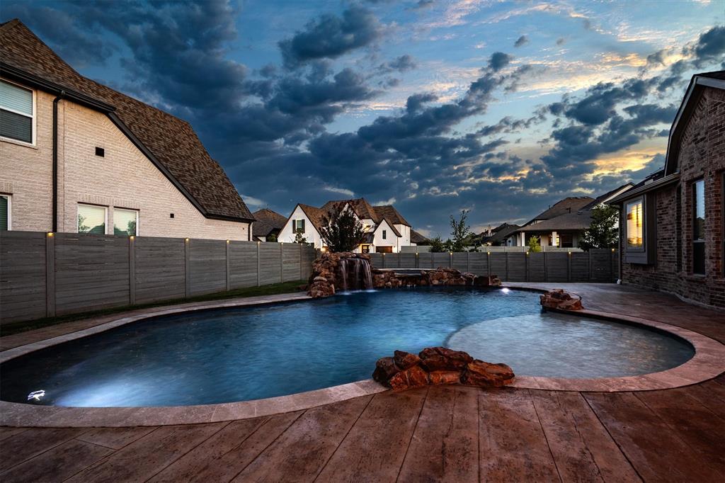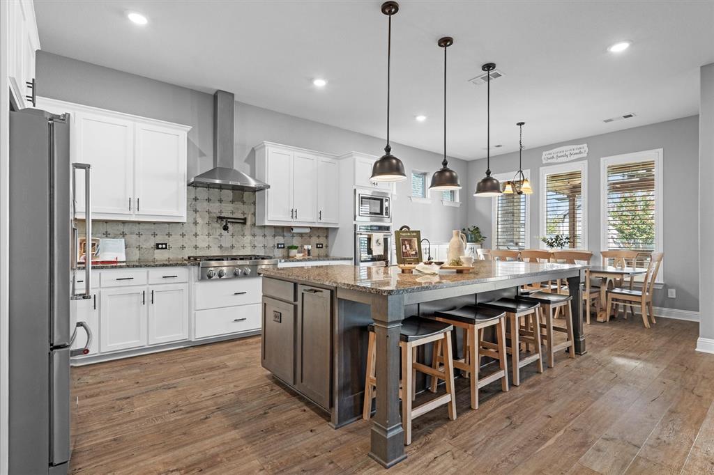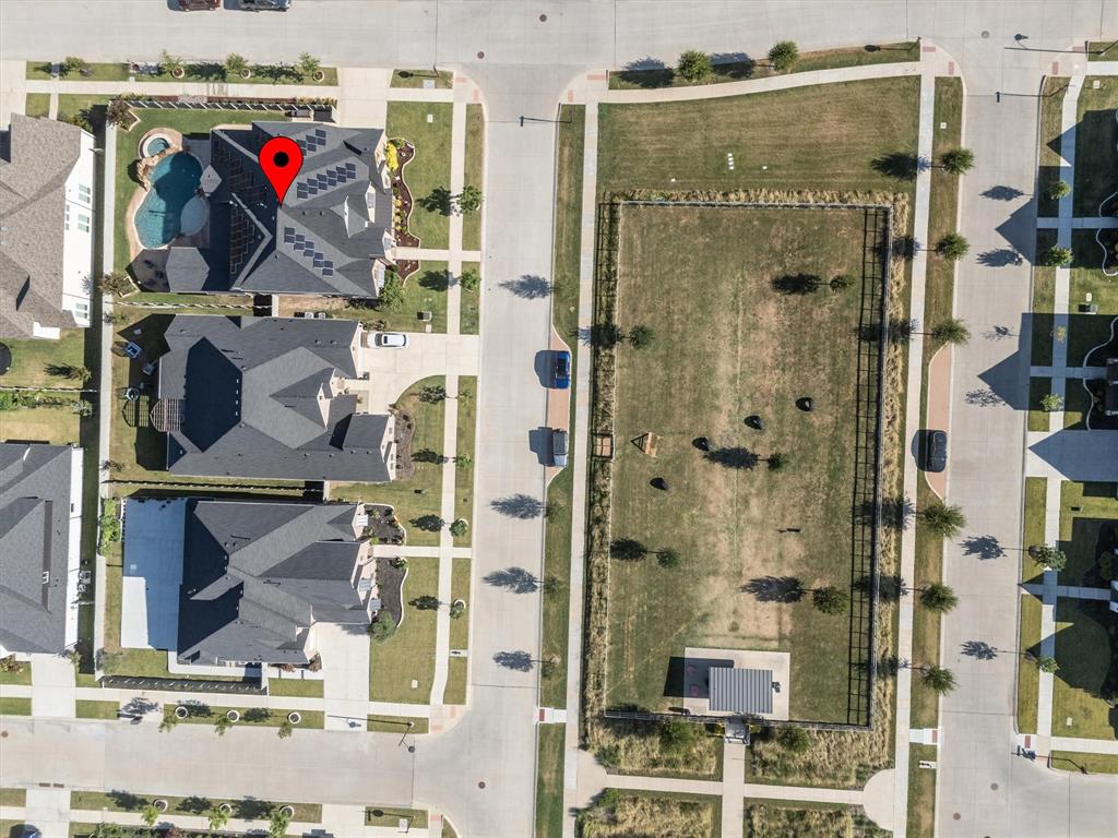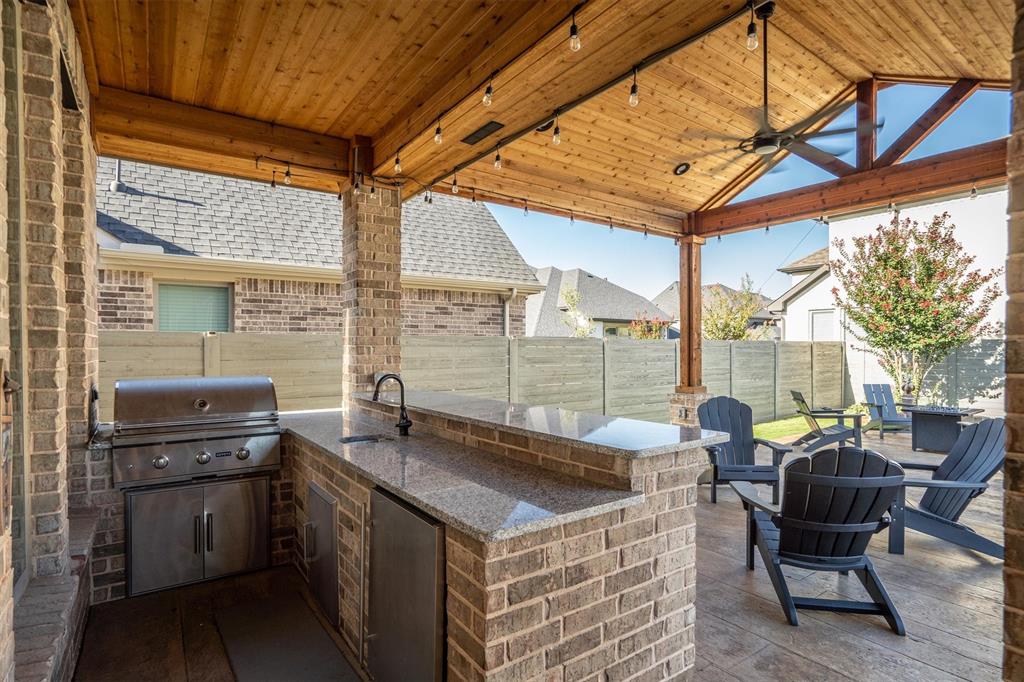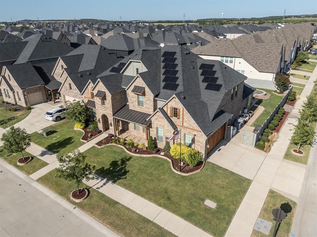 Welcome home! This expansive two-story gem is nestled in the highly sought-after Harvest Community and zoned to top-rated Argyle ISD, perfectly situated on a spacious corner lot. From the moment you arrive, you're greeted by a professionally landscaped front yard, programmable outdoor lighting, and a charming front porch, ideal for peaceful mornings or relaxing evenings. Inside, enjoy a dedicated home office with custom built-ins—perfect for remote work or study. The open-concept living area offers generous space for gathering and flows seamlessly into an oversized chef’s kitchen with a large island, breakfast bar, farmhouse sink, pot filler, double ovens, and a sunlit breakfast nook. Retreat to the luxurious primary suite featuring a spa-like bath and walk-in closet with direct access to the laundry room. A second main-floor bedroom with built-ins provides flexible space for guests , crafts, or multigenerational living. Upstairs, you’ll find a game room with wet bar cabinetry, a separate media room, and three oversized bedrooms with ample closet space.