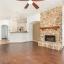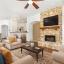 The open-concept kitchen flows seamlessly into the living area, ideal for entertaining or family gatherings. It offers additional bar seating, a dedicated dining area, and overlooks the cozy living room where a wood-burning fireplace serves as a stunning focal point.