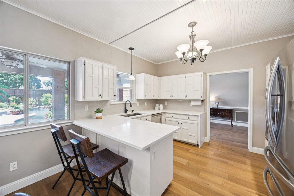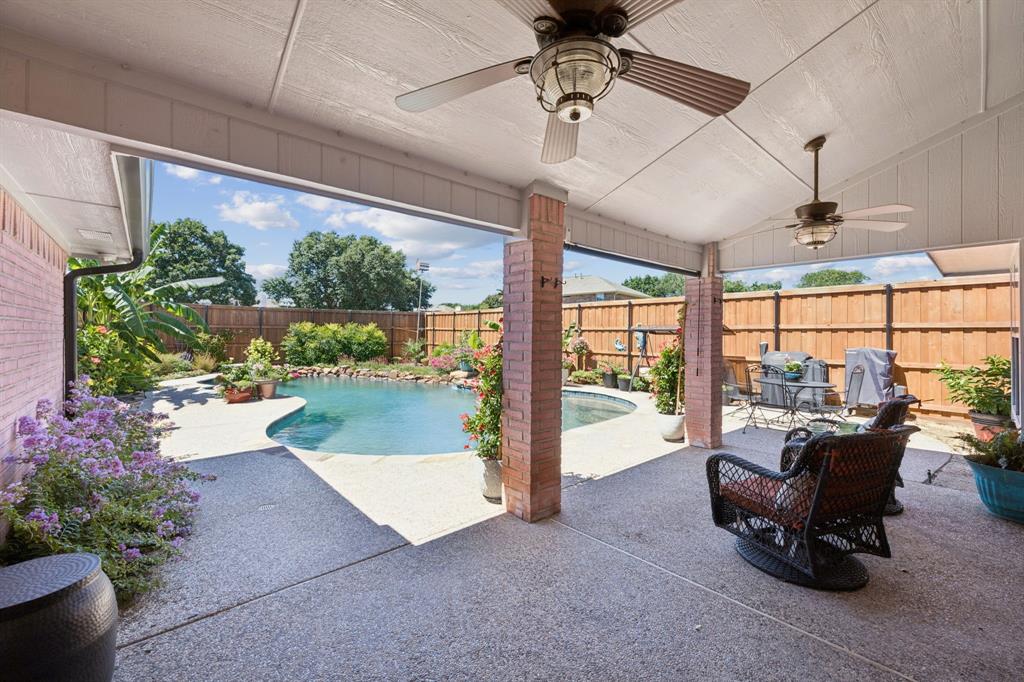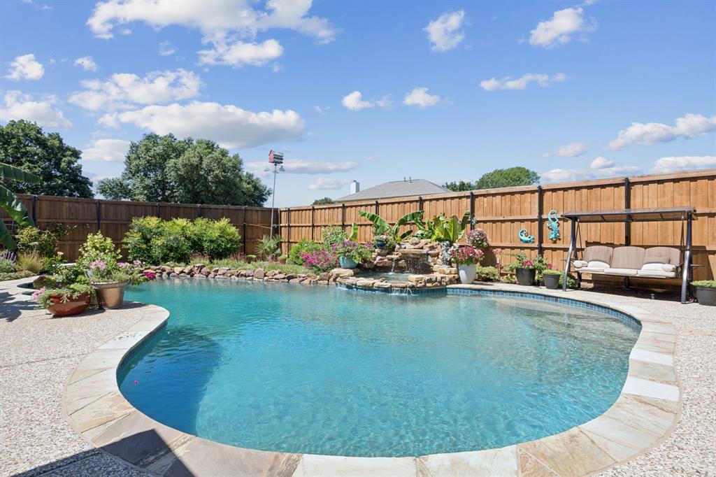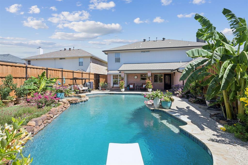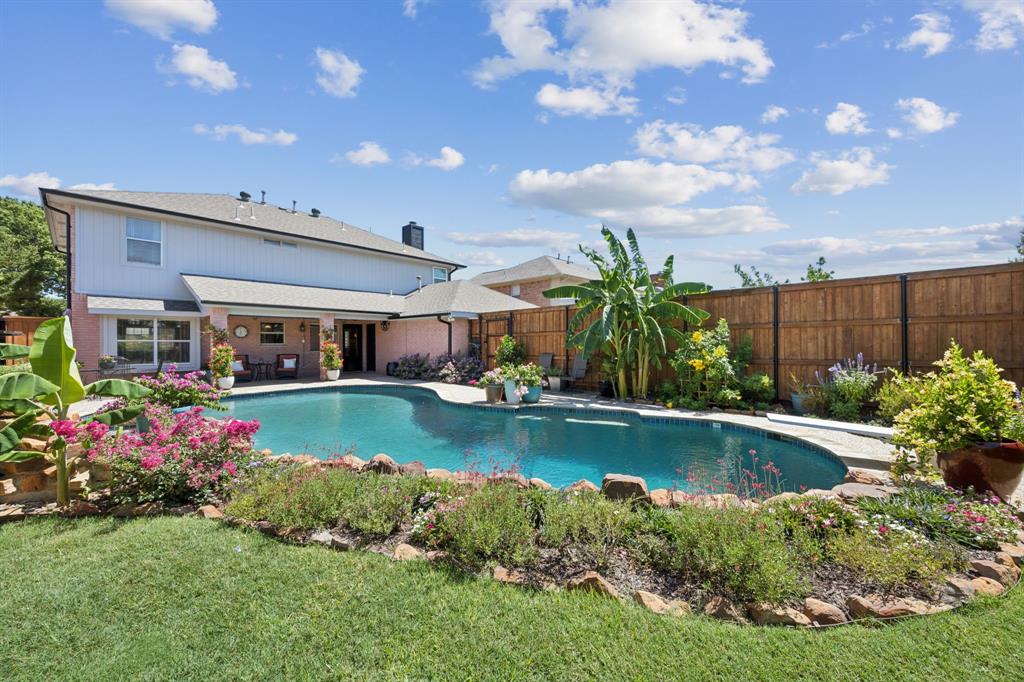 Located in highly rated Rockwall ISD, this home blends comfort, convenience, and community in a setting you’ll love coming home to! Just minutes from lake life fishing, boating, sunsets and vibrant dining, with easy access to downtown Dallas within 20 minutes. Splash into your private saltwater pool with diving depth on one end, featuring a tranquil rock waterfall, surrounded by vibrant blooms and the seclusion of a 9' cedar privacy fence. An oversized back driveway offers plenty of parking, making entertaining a breeze. Whether you're grilling with friends or soaking up the sun, this lush outdoor space was made for memory-making. Inside, this stately 4-bedroom brick home has been lovingly maintained by the same family for over 30 years. Enjoy recently updated engineered hardwood floors and a bright, cheerful kitchen featuring quartz countertops and a pass-through window to the back covered patio, perfect for easy outdoor dining. With two generous living areas and a flexible formal dining or bonus space, there's room to relax or entertain. Upstairs, the grand owner’s suite offers a private retreat with an ensuite bath garden tub and separate shower plus a spacious walk-in closet. Three additional bedrooms and an updated full bath provide comfort for guests or family. Here, every day feels like a getaway!