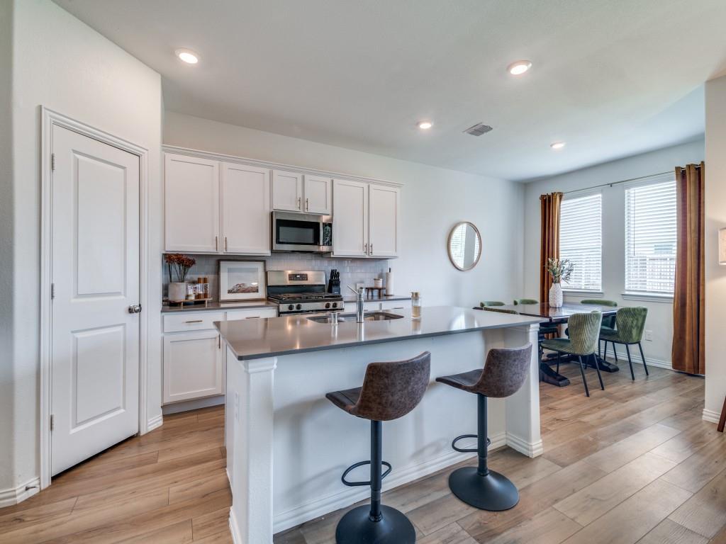 Delightful Single-Story home with 9 ft. ceilings and a blend of charm and modern convenience. Boasting 4 spacious bedrooms and 2 well-appointed bathrooms, this home is designed for comfortable living and entertaining. Step inside to a bright and inviting open floor plan, accentuated by Luxury Vinyl Plank flooring that flows seamlessly throughout the entire home. Each room is thoughtfully designed to maximize space and functionality. The heart of the home is the kitchen, complete with Quartz countertops, gas range, soft close drawers and cabinets, and an island. The living room, adjacent to the kitchen, provides a cozy setting for relaxation or hosting gatherings. Several rooms have been freshly painted. Large windows allow natural light to cascade in, enhancing the warm ambiance of the space. The private backyard, enclosed by a sturdy wood fence and a covered patio, provides the perfect spot for enjoying the tranquility of your own space. The community has 3 pools, parks, and a community center with a gym. This home is not just a place to live but a sanctuary where lasting memories are made. Experience this captivating home and discover why it stands out in today’s market.
