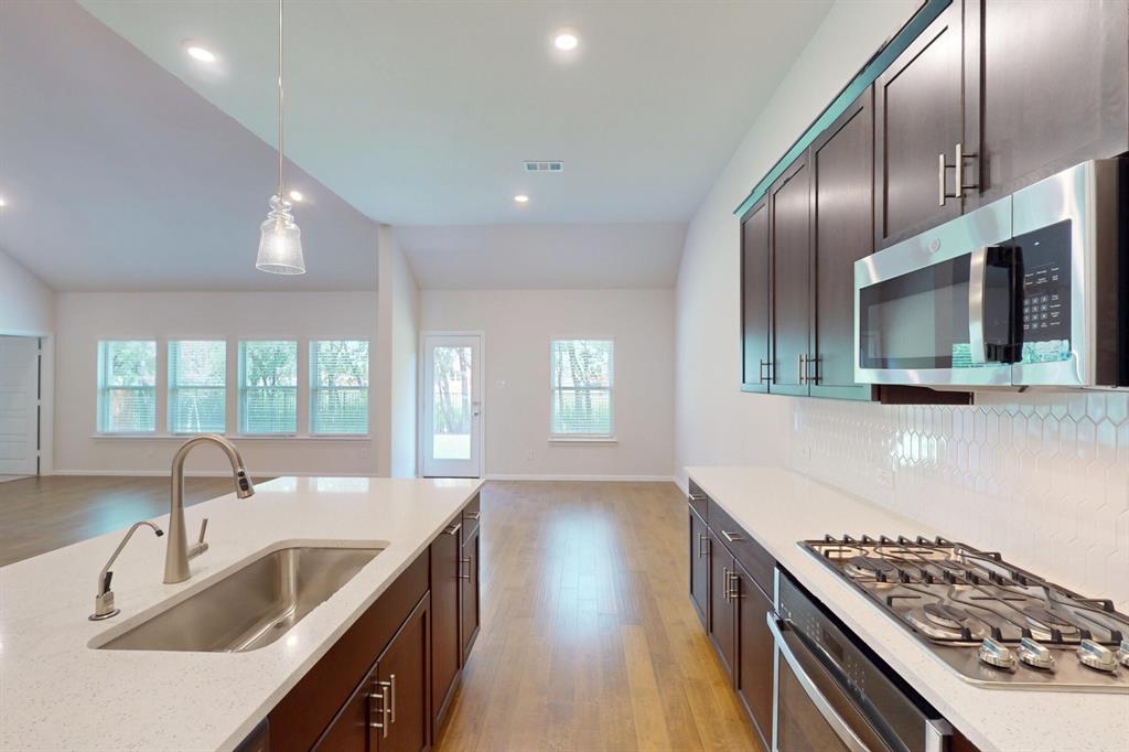The kitchen is a standout feature with impressive white quartz countertops, stainless steel appliances, richly stained cabinetry, and even extra drawers for pots and pans. The single bowl undermount sink enhances the large center island along with 2 pendant lights to further illuminate the space.