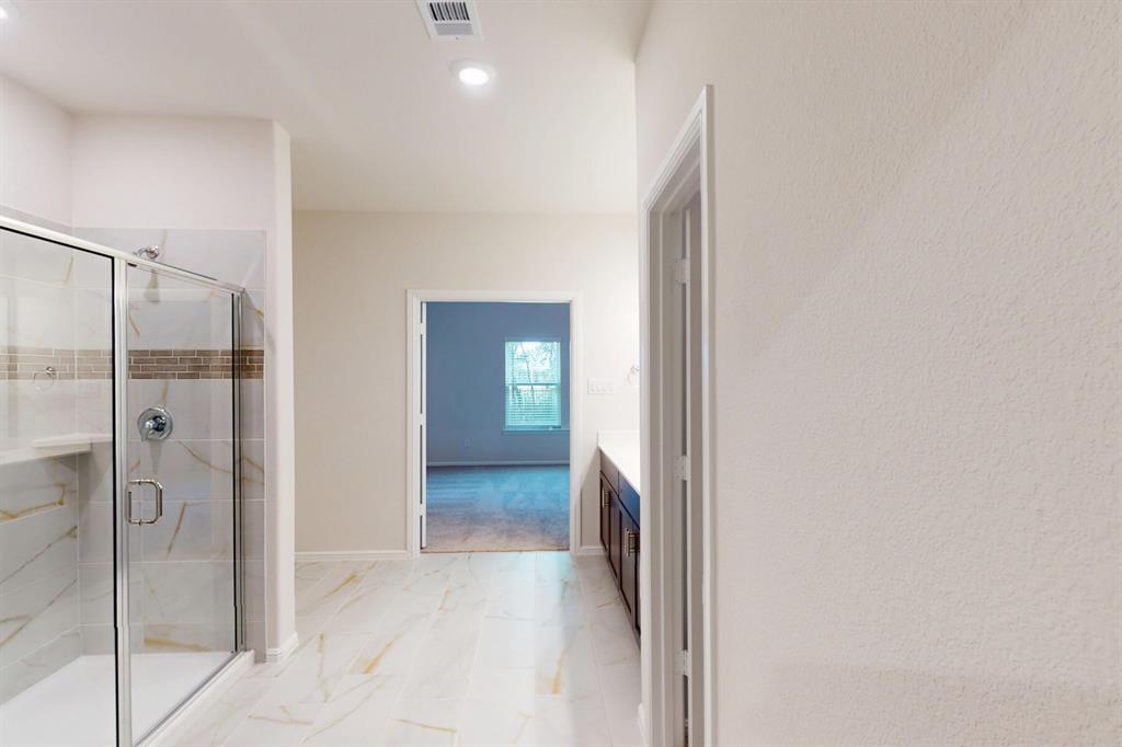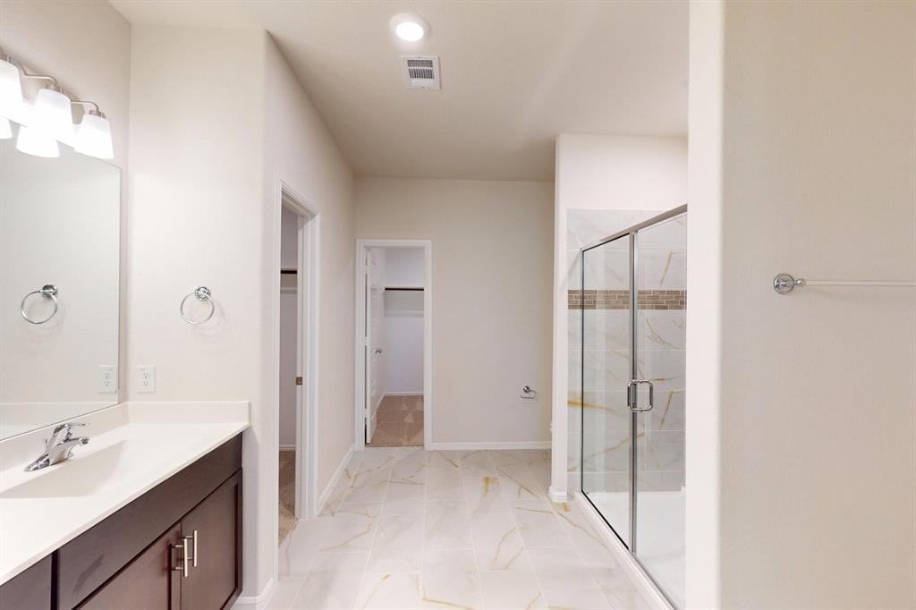 The owner's suite is a luxurious retreat, complete with an en-suite bathroom with dual sinks, modern tile selections, a walk-in shower, and not one but two walk-in closets.