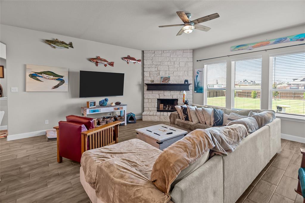 The living space is anchored by a floor-to-ceiling stone fireplace and a wall of windows that flood the room with natural light and offer peaceful backyard views. The wood-look tile flooring throughout the main living areas adds warmth and durability.