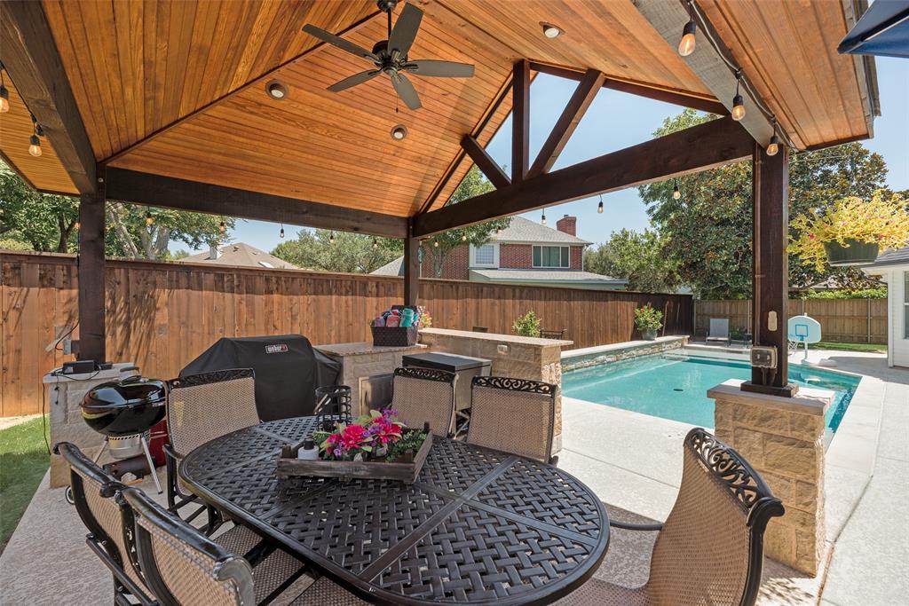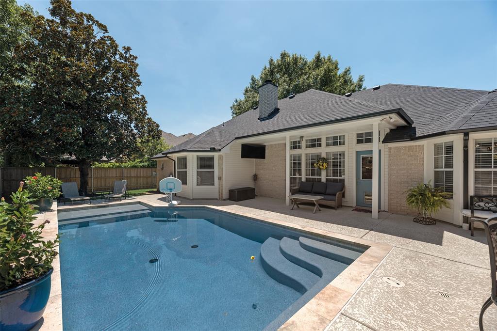 Welcome to this beautifully upgraded single-story home, designed for effortless living and unforgettable entertaining. The open floor plan flows seamlessly from room to room, with a spacious living area that opens directly to the stunning covered patio and a resort-style swimming pool—perfect for hosting gatherings or relaxing in style. The chef’s kitchen is a true showstopper, featuring stainless steel appliances, both gas and electric ovens, a gas cooktop, designer vent hood, quartz countertops, and a large kitchen island. The kitchen overlooks a sunny breakfast area and the inviting living room, making it the heart of the home. Off the entryway, you’ll find a formal dining room, ideal for holiday meals and special occasions. The primary suite is generously sized, offering comfort and privacy, complemented by two additional well-appointed bedrooms. Additional highlights include: Roof replaced just 1 year ago, AC replaced in 2022, upgraded finishes throughout, fantastic layout for indoor-outdoor living. This home truly checks all the boxes for style, comfort, and entertainment potential. Don't miss it!