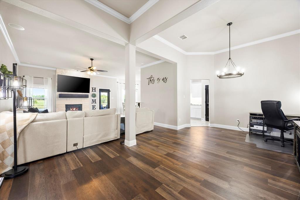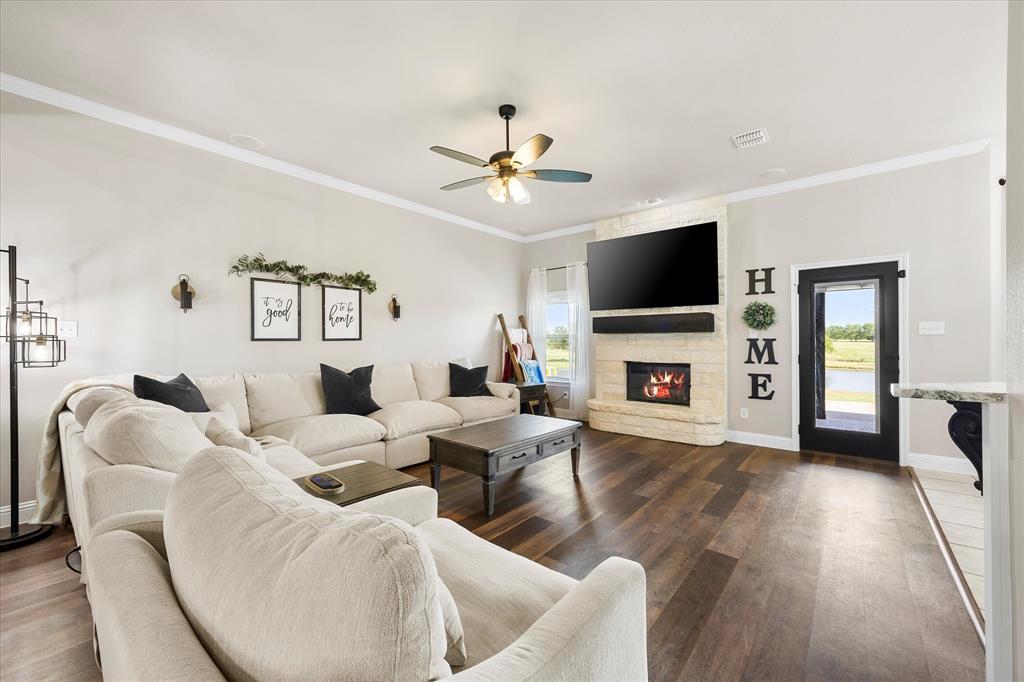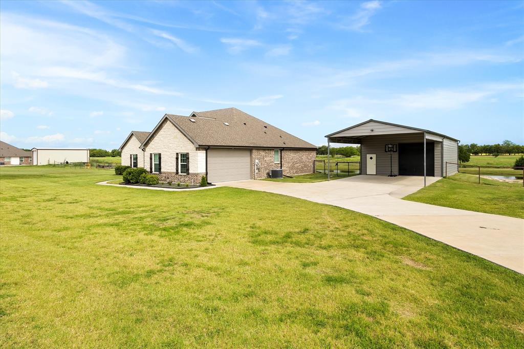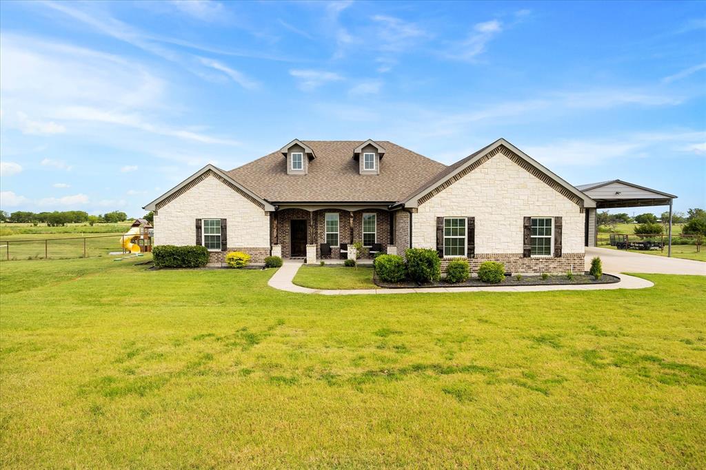 Unparalleled luxury and tranquility in this stunning 4 bedroom, 2 bathroom home situated on a sprawling 4 acre estate in the picturesque landscape of Caddo Mills, TX. This exquisite property is the epitome of refined country living, offering both a luxurious interior and captivating outdoor spaces that promise to impress. Step inside to be greeted by an expansive, open-concept living area that radiates warmth and sophistication. Light streams through large windows, dancing across elegant luxury vinyl flooring, recently painted walls, and detailed crown molding. The spacious living room is centered around a charming wood-burning fireplace, creating a cozy ambiance for relaxation or entertaining. Adjacent to the living area, a versatile space serves as a formal dining room or home office, catering to your lifestyle needs. The heart of the home is the gourmet kitchen, showcasing crisp white cabinetry, pristine granite countertops, and state-of-the-art stainless steel appliances. Enhanced with a pot filler for added convenience, this kitchen is designed for both everyday culinary creations and lavish entertaining. Retreat to the primary suite, a true sanctuary that offers an ensuite bathroom featuring dual sinks, a luxurious soaker tub, and an oversized shower. All secondary bedrooms boast generous proportions and include walk-in closets, providing ample storage and personal space for each resident. The allure of this property extends beyond its interior. The estate is beautifully landscaped and features a large covered patio, perfect for hosting guests against the backdrop of spectacular sunsets. The view extends to a tranquil pond, ideal for evening fishing. A prized workshop with electric adds functionality, catering to hobbyists and craftspeople alike. Fully enclosed with elegant black pipe fencing, this property offers security and serenity in a truly idyllic setting. Embrace a life of luxury and natural beauty in this extraordinary home!