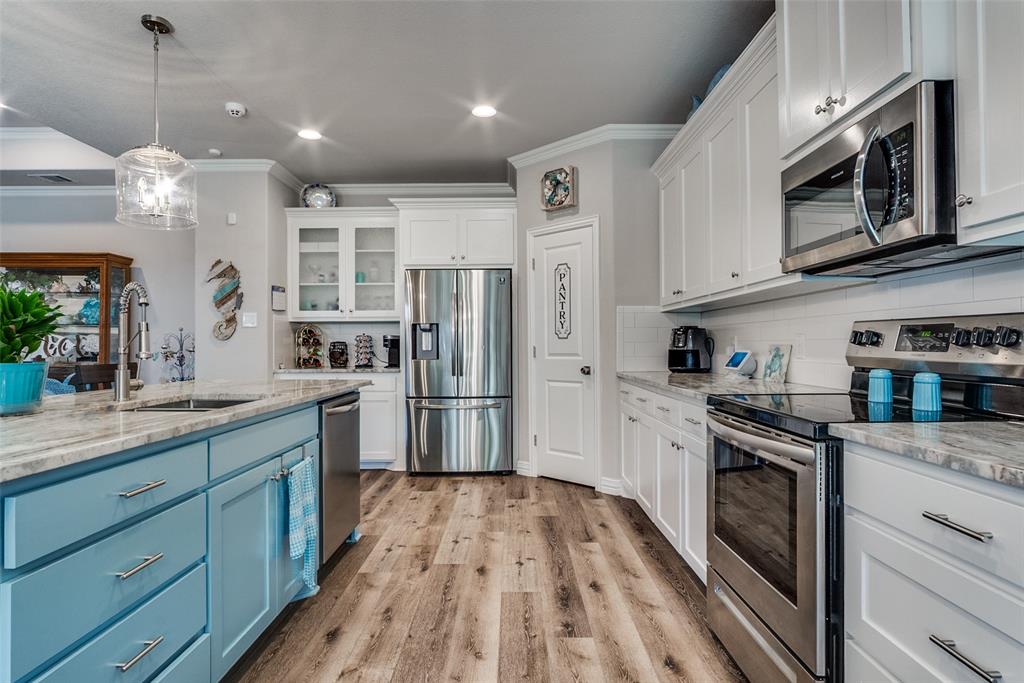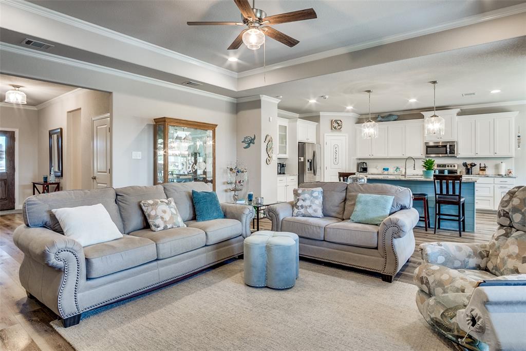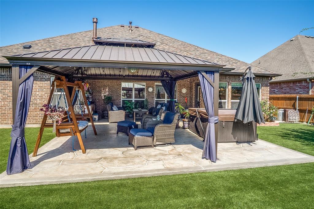 *LIKE NEW SINGLE STORY W INCREDIBLE OUTDOOR OASIS HAS CUSTOM FEATURES THROUGHOUT* The mature landscape welcomes you into the 6ft wide entry w crown molding, neutral paint, AI Smart Home Switches & upgraded flooring throughout. The charming living room has a tray ceiling, large window wall & custom shiplap accented gas start fireplace. The kitchen has an expansive granite island with 4 bar seats, stainless appliances, custom shaker cabinets, electric range oven, large pantry & built in microwave. The breakfast room is full size with room for a large table and has direct access onto the manicured patio. The primary ensuite boasts a niche desk area, tray ceiling, extended upgraded granite dual vanities, a walk in ADA tub w separate shower & large walk in closet w custom shelving system. The split layout adds privacy and offers two additional secondary beds each with large closets and direct access to the full bath with an extended vanity, linen closet & shower tub combo. The utility room is full size w a drip dry area, built in cabinets and second pantry. The backyard oasis has an owner added 20x13 covered patio AND a 10x10 cabana. 1 Year New Hot Tub is perfect for cooling off in the summer or warming up in the winter! Master gardener custom landscape installation w french drains, drip irrigation, gravel walkways, solar screens, custom landscape beds, sprinklers & gutters. Low maintenance all turf yard comes w a turf broom robot! The oversized 2 car garage has an epoxy floor & decked attic. 2025 Roof & Gutters. 2023 New Tankless Water Heater. Solar panels save on electric bill.