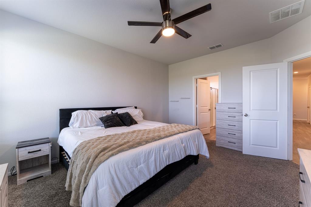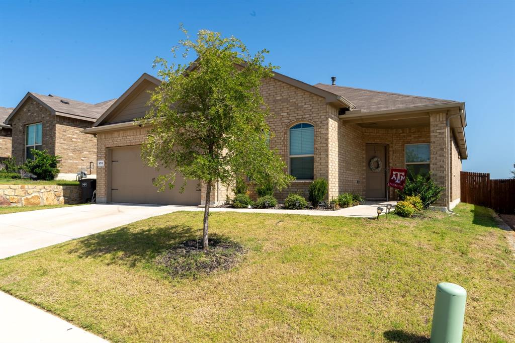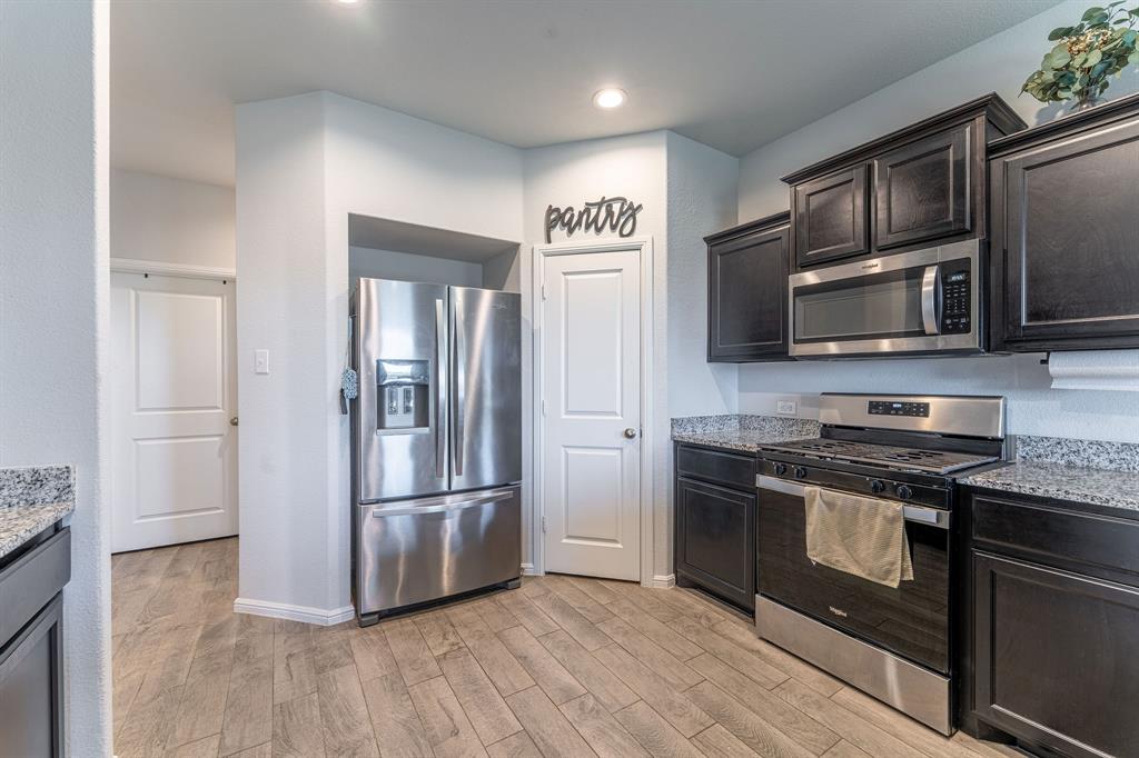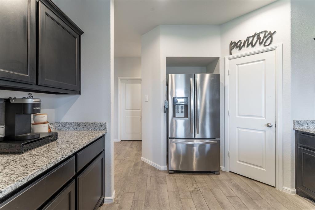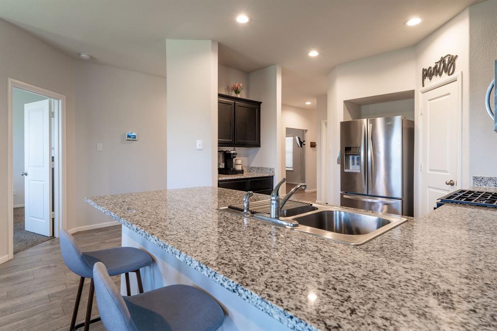 Welcome to this beautifully maintained home, built in 2022 by D.R. Horton. Featuring 4 spacious bedrooms, 2 full bathrooms, and a dedicated home office, this home blends modern design with practical living. At the heart of the home is an open-concept kitchen with a peninsula island, granite countertops, and rich dark cabinetry—perfect for cooking, entertaining, or casual family meals. The kitchen flows effortlessly into the dining and living areas, creating a warm and inviting atmosphere. Enjoy wood-look tile flooring throughout the living areas, kitchen, hallways, and bathrooms, with plush carpeting in all bedrooms for added comfort. Step outside to relax on the charming front porch or unwind under the covered back patio, ideal for outdoor gatherings year-round. Located in a vibrant community Chapel Creek which offers great amenities, including a community pool and playground, this home has everything you need for comfortable and connected living.