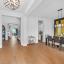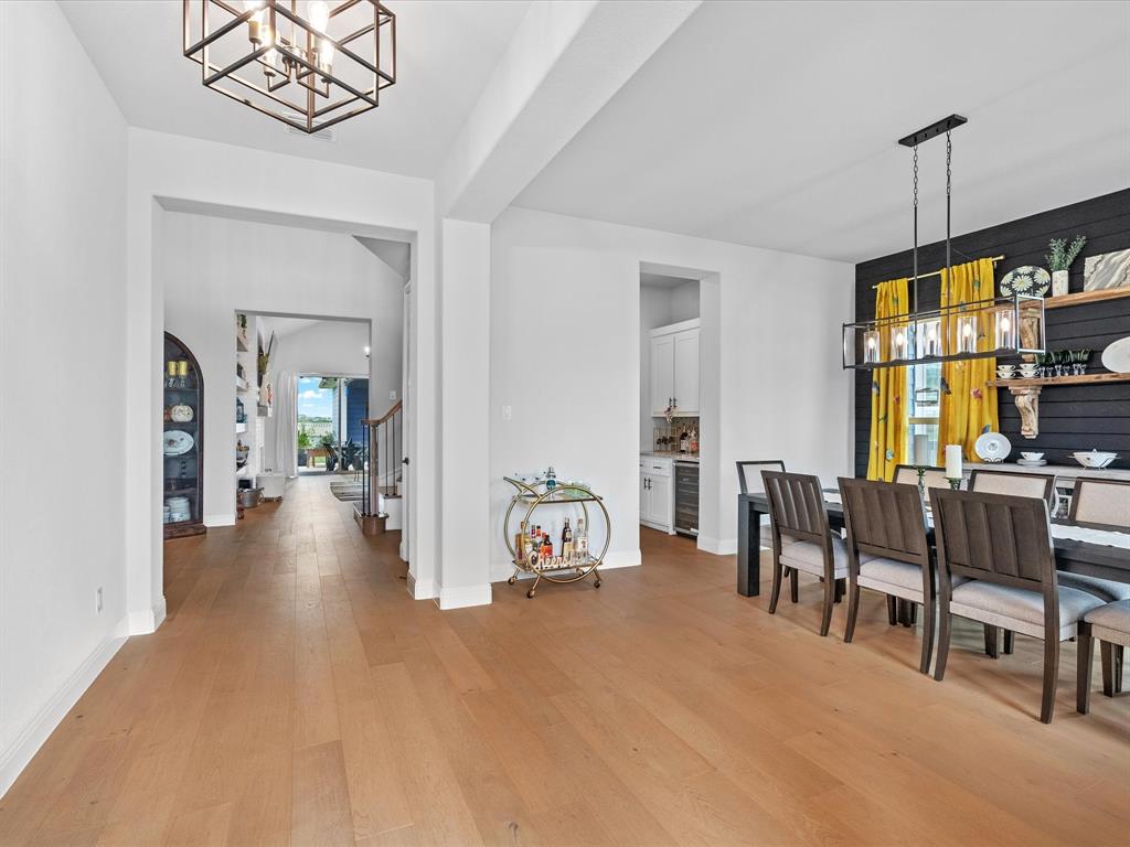The heart of the home showcases level-two engineered hardwood floors and a three-panel sliding glass door system that seamlessly connects the indoor living space to an inviting outdoor entertaining area. The gourmet kitchen boasts a gas range, double oven, a spacious pantry, and a stylish wet bar linking the kitchen to the formal dining room.