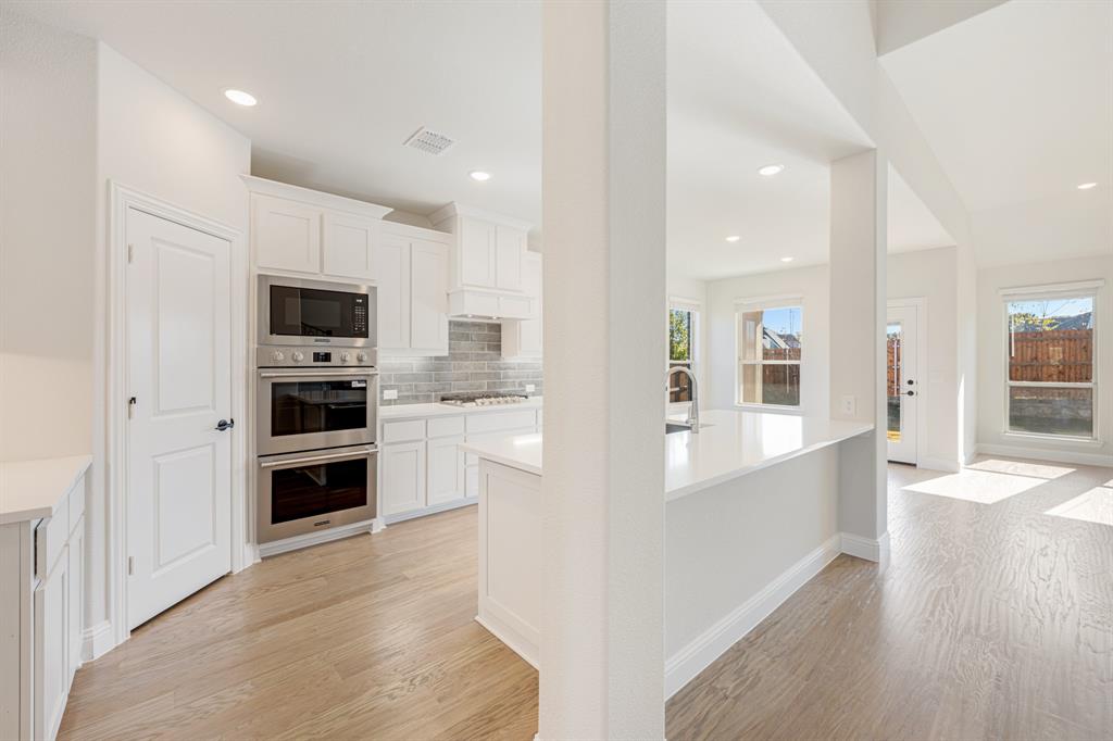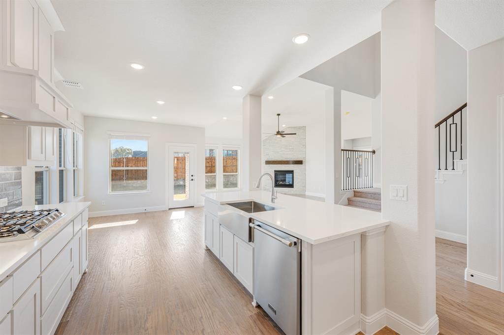 The gourmet island kitchen features custom cabinetry, beautiful quartz countertops, and high-end Professional Series appliances including double ovens and a 5-burner gas cooktop. Appointments such as pot and pan drawers and a wood vent hood provide style and functionality. The comfortable family room, boasts a direct vent fireplace with gas logs, and luxurious hardwood flooring that flows throughout the first-floor common areas.