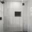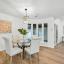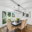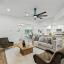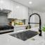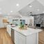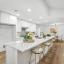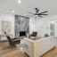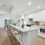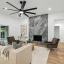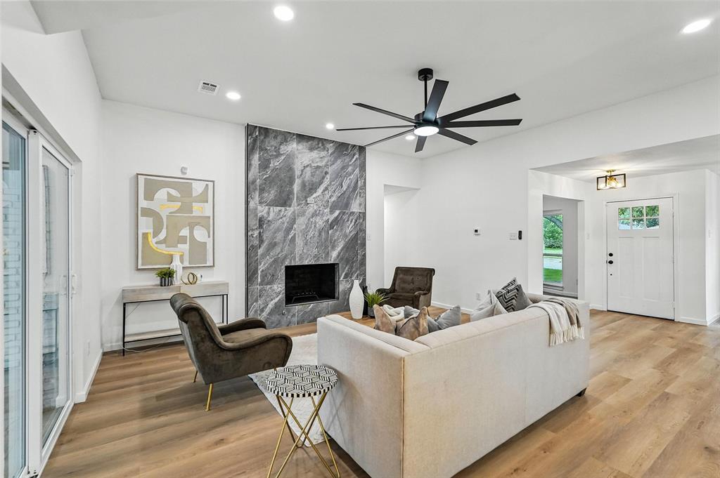 Step inside to a spacious living area anchored by a sleek floor-to-ceiling fireplace, flowing seamlessly into the dining space and gourmet kitchen. The chef’s kitchen features quartz countertops, custom white shaker cabinetry, stainless steel appliances, and a large island with seating—ideal for both cooking and entertaining.