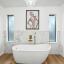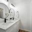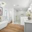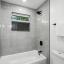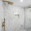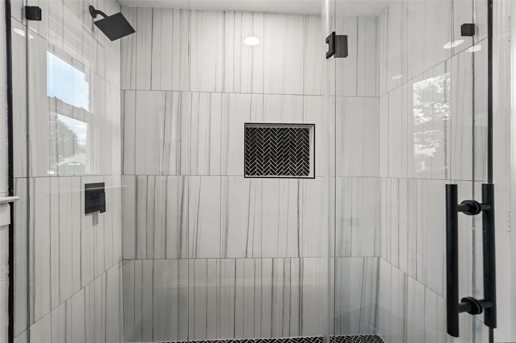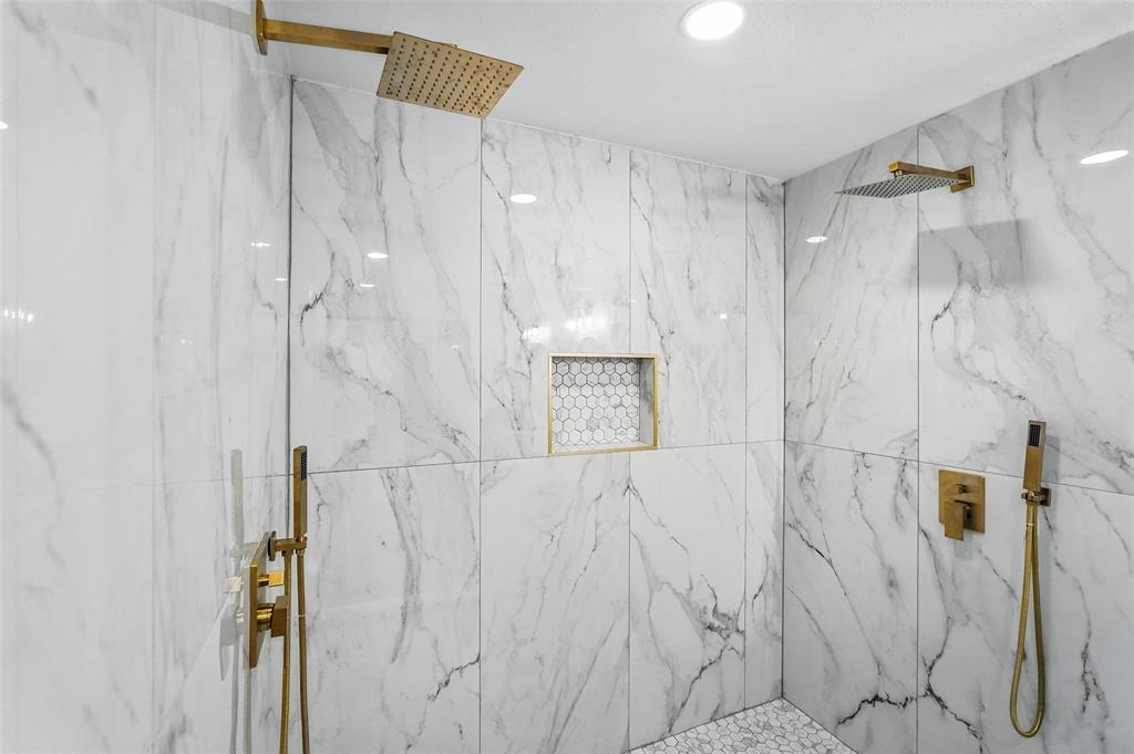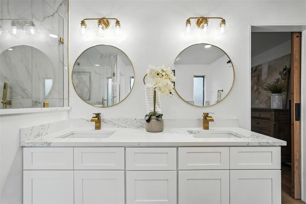 Retreat to the luxurious primary suite, complete with a spa-like bathroom featuring a freestanding soaking tub, oversized walk-in shower, dual vanities with quartz counters, and gold-accent fixtures. Additional bedrooms are generously sized and share beautifully updated baths with modern tilework and designer lighting.