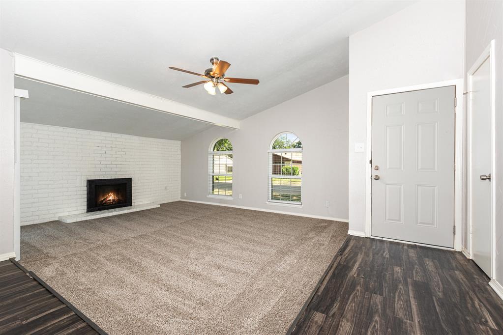 Charming 3 bed, 2 bath, 1,844 sq ft home in Bedford! This property includes a sunk-in living room with a cozy wood-burning fireplace and abundant natural light. The primary suite offers an attached bathroom, a spacious walk-in closet, and sliding glass doors that open to a patio. The open-concept kitchen with an island and seating flows into the dining room, which features a wet bar, perfect for entertaining. The second bedroom has an attached bathroom that also serves as a hallway bathroom, easily accessible to the third bedroom; spacious bathroom is equipped with accessible handgrips in the shower-bathtub combo. Additionally, the property boasts a spacious backyard, ideal for family gatherings. This home would be beneficial for multi-generational living and is clean, freshly painted throughout, and move-in ready.