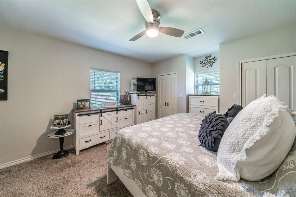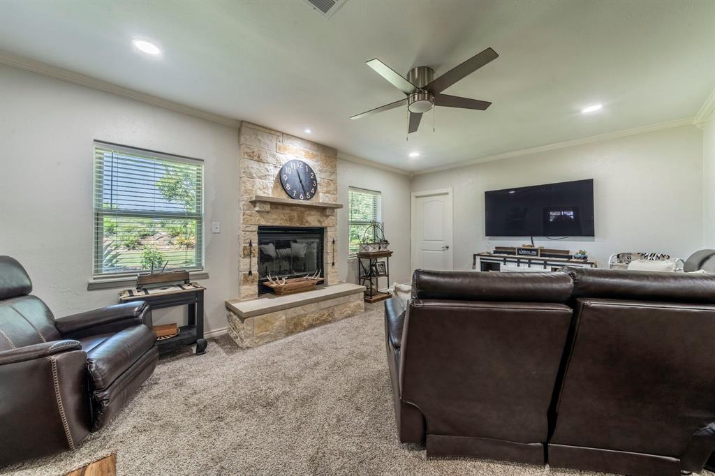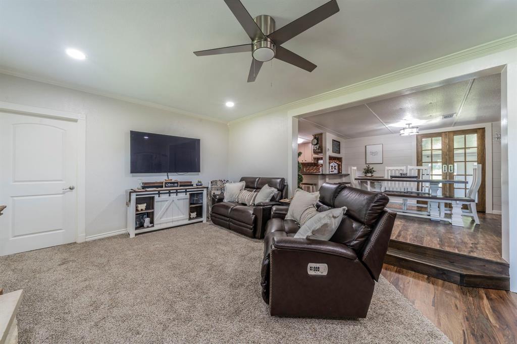 The 1,776 sf 3BR 2B house has new roof and gutters and new central heat-air and ductwork completed in 2024. The home has two living areas, a formal living room with wood-burning fireplace and a large family room at the rear. The primary bedroom includes his and hers closets and an attached bath. The kitchen has stainless appliances, lots of cabinet space, and an attached dining area. The house has updated lighting, mostly LED, and Low-E windows. Flooring includes both carpet and laminate throughout. A landscaped berm between the house and the road creates privacy.