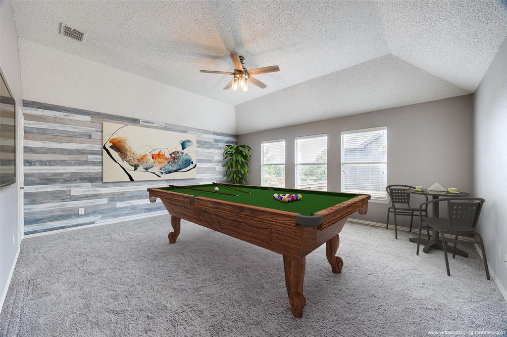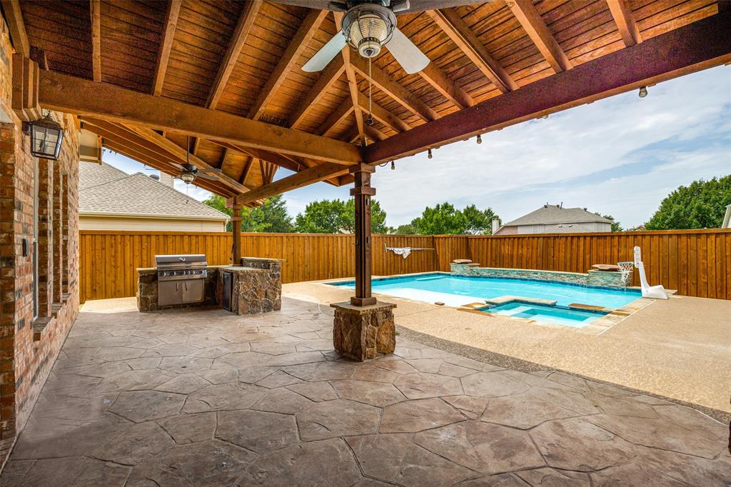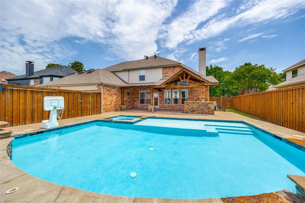 Ideal layout with the primary suite and an additional bedroom + full bath on the main floor. Upstairs offers three oversized bedrooms, all with walk-in closets, plus a large game room. Step outside to your private backyard oasis featuring an extended covered patio with outdoor living and dining areas, outdoor built in grill area, a custom pool & spa with tanning ledge, and plenty of yard space to play or relax.