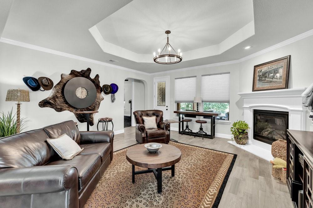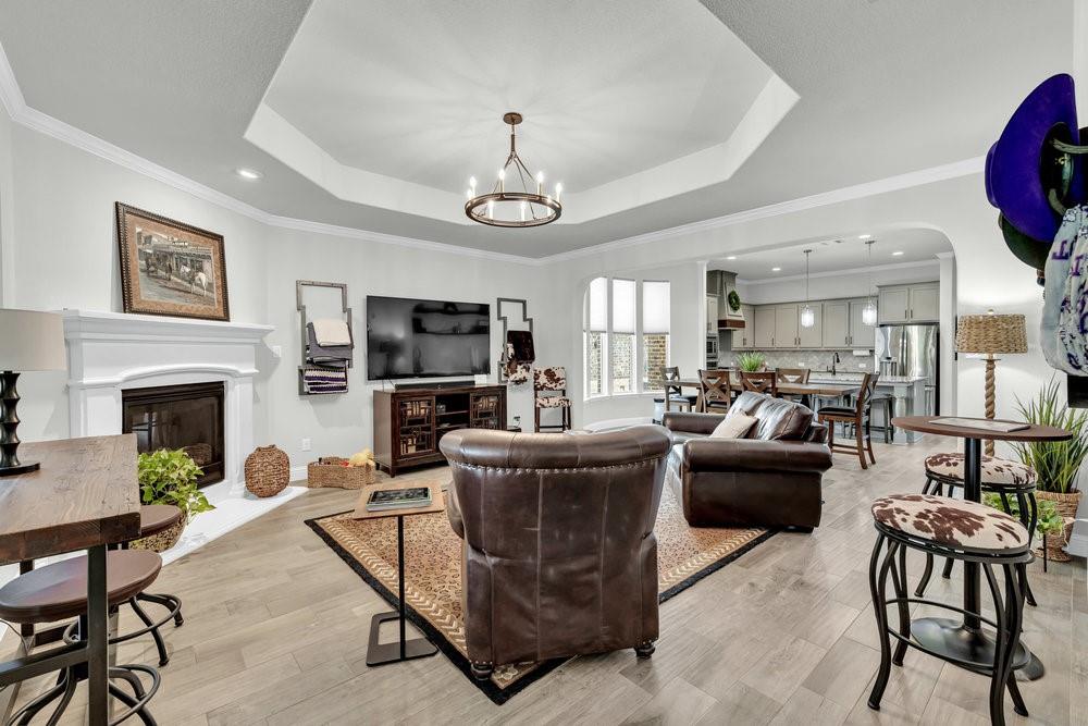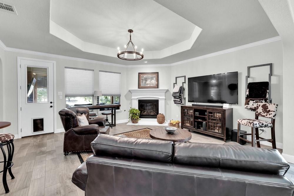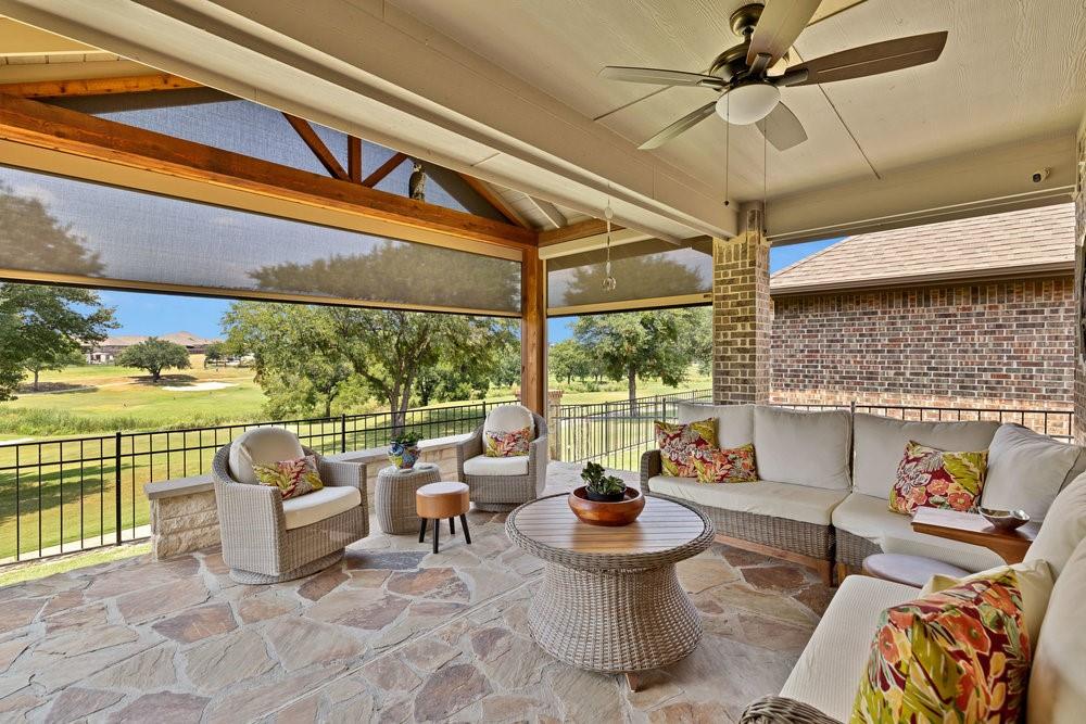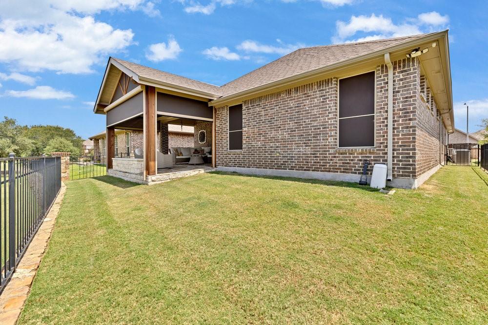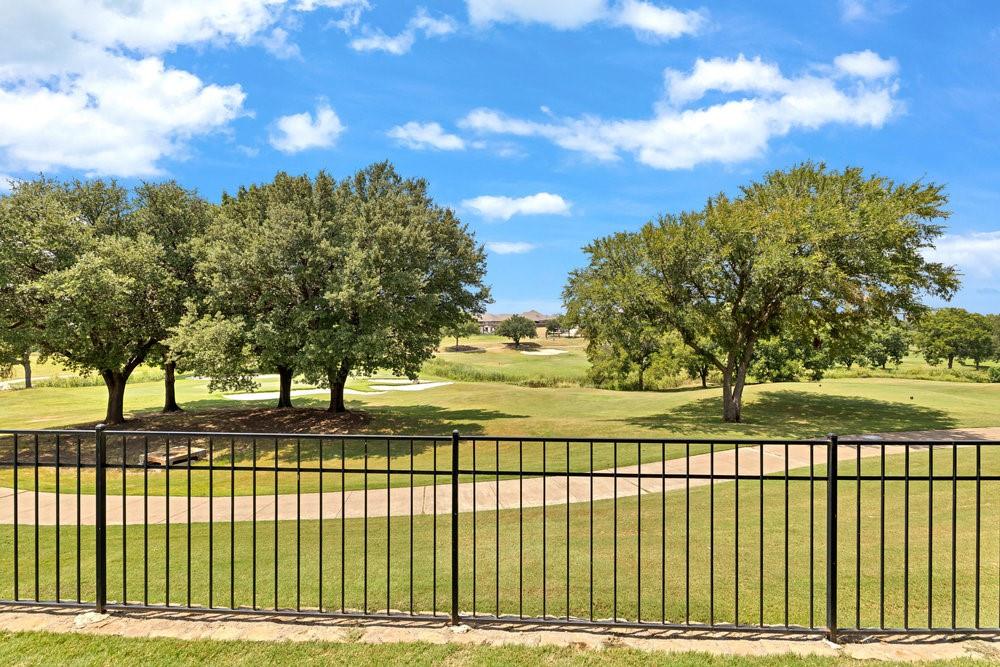 This thoughtfully upgraded 3-bedroom, 2.5-bath home blends style and comfort with modern finishes throughout. Inside, 8-foot doors create a spacious, elegant feel, while shiplap accent walls in the extra bedroom and primary suite add custom charm. The kitchen is a standout, featuring a large island, an upgraded coffee bar with herringbone tile detail, and cedar shelving for warmth and character. The primary suite offers a spa like retreat with an oversized steam shower and dual walk-in closets for His & Hers. The garage has been expanded by 5.5 feet and finished with epoxy floors, full insulation, and air conditioning—ideal for a workshop, gym, or extra storage. Step outside to enjoy the extended covered patio 14 X 17 with remote-controlled screens, all while taking in serene views of the golf course, perfect for relaxing or entertaining year round. You must see this one of a kind home in fossil creek. Convenient to I35, shopping and restaurants.
