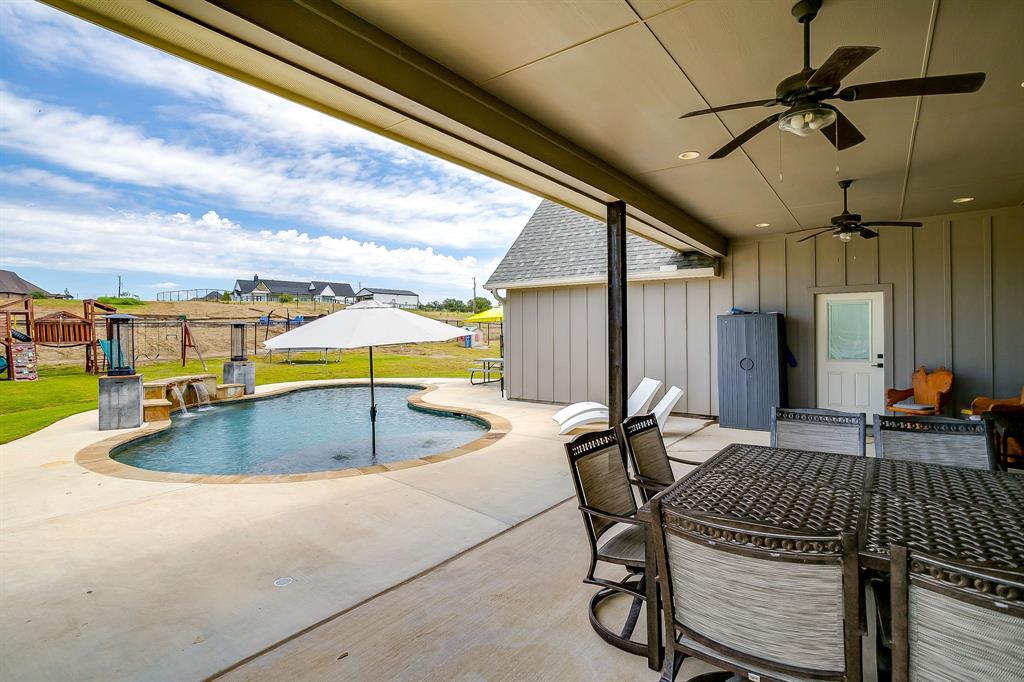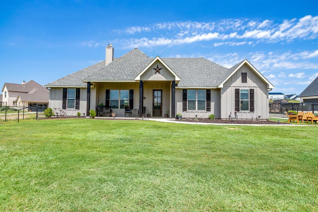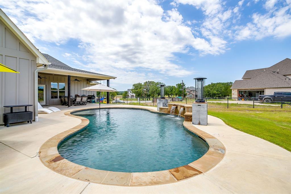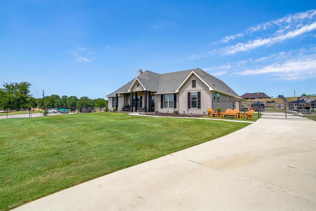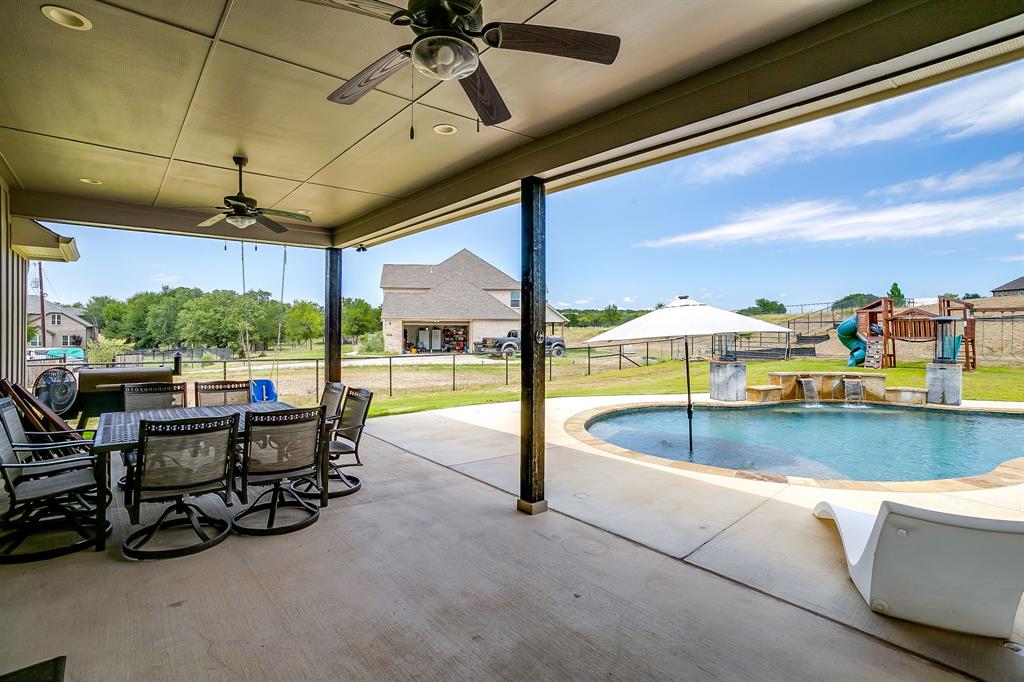 WELCOME HOME! This farmhouse style home on 1-acre in El Dorado Estates is nestled in a quiet cul-de-sac! Enjoy a sparkling pool with water feature with a covered back patio. The entry to the property is gated and the entire property is fenced with a cross fencing feature. There is minimal HOA with chickens allowed! As soon as you walk past the front porch, you are instantly welcome to an open-concept layout with a cozy fireplace and floating shelves in the living room. It is so bright and airy! The kitchen is GORGEOUS with two-toned custom cabinetry, double oven and a sought-after white ceramic farmhouse sink that overlooks the backyard. You will be IMPRESSED by the oversize pantry and laundry room! This split floorplan is convenient with the primary bedroom having a direct connection from the laundry to the closet. Sleek white cabinets with a vanity feature and calming materials for the bath! The secondary rooms are spacious with their bathroom in between both bedrooms. Upstairs is set up as a mother-in-law suite with full bathroom and closet, but it can be used as a game room or theatre room! There is a door at the bottom of the stairs to close it off. This backyard is JAM-PACKED with functionality and usage. Not just the pool, but the back patio, accessibility to the garage, dual fans and plenty of space for animals in the cross fenced area. This property has it ALL! Come check it out!