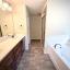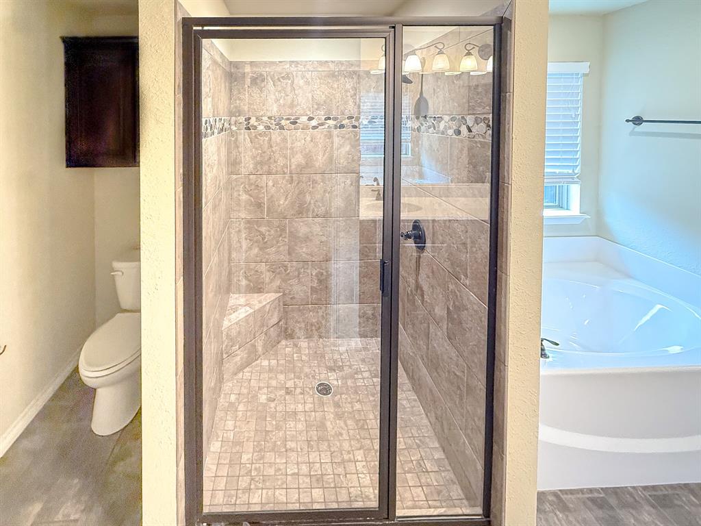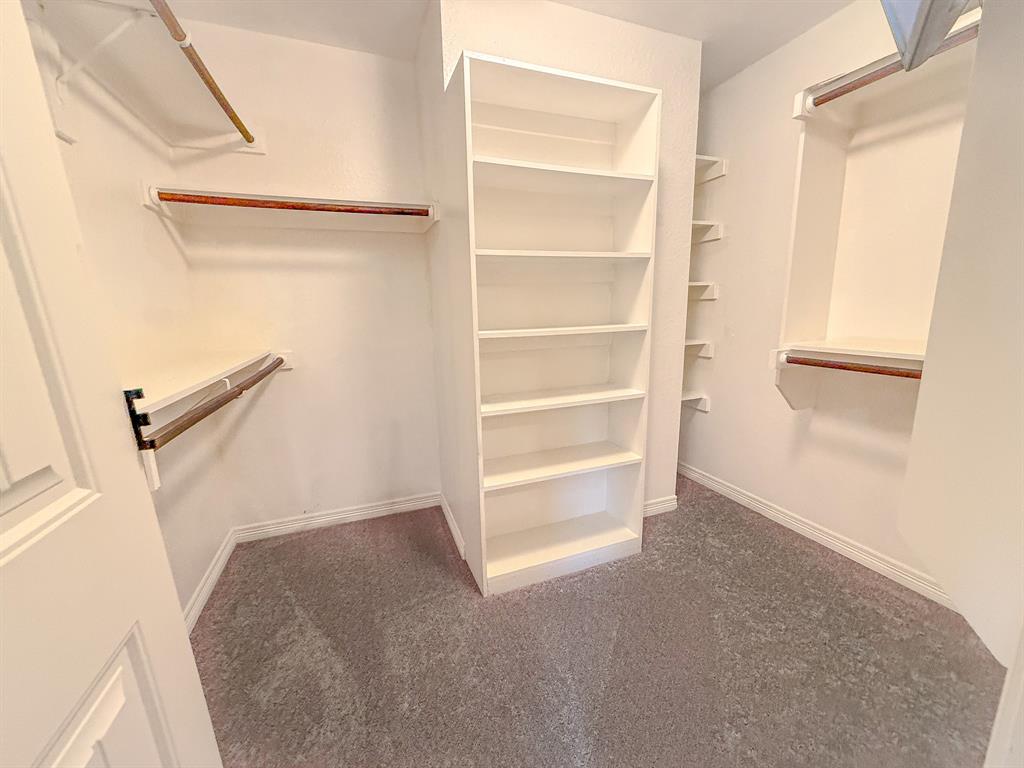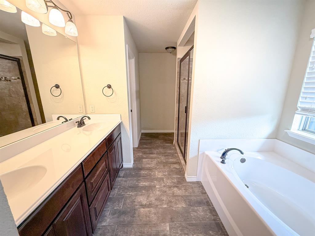 going into the bathroom which features a garden tub, dual sinks, decorative shower, and walk-in closets. The secondary