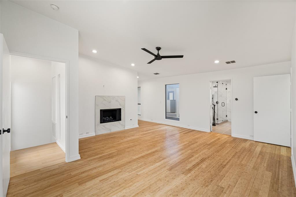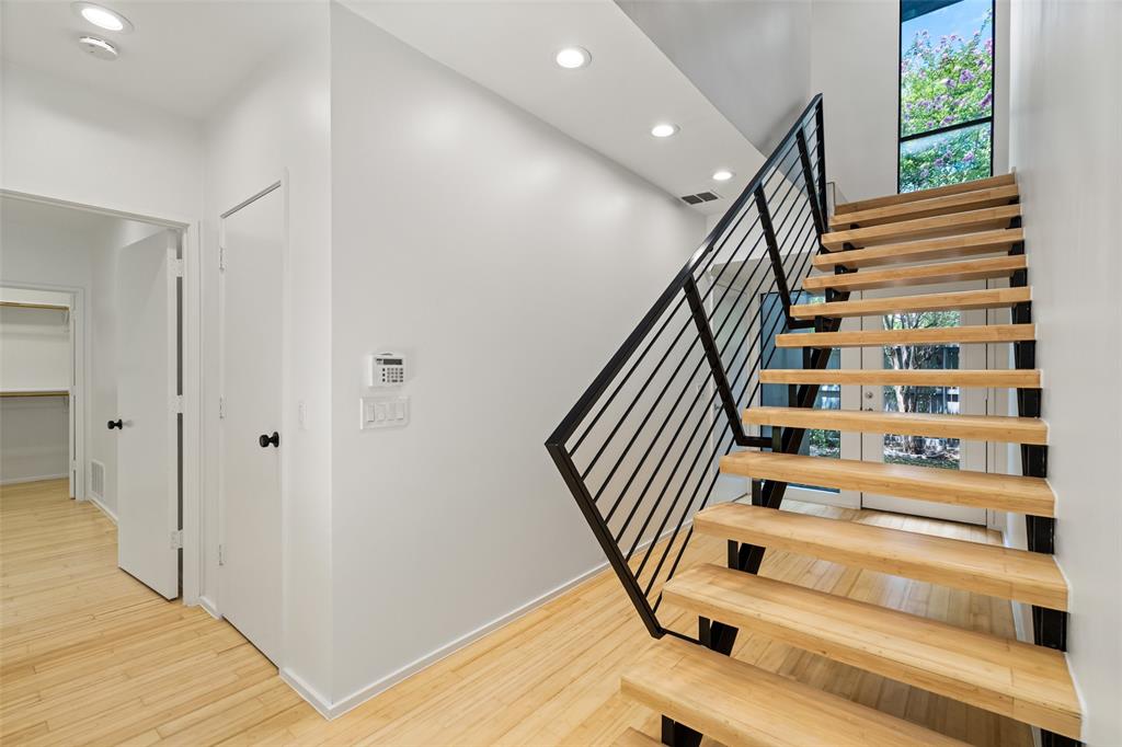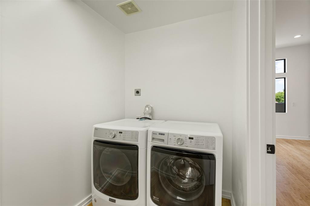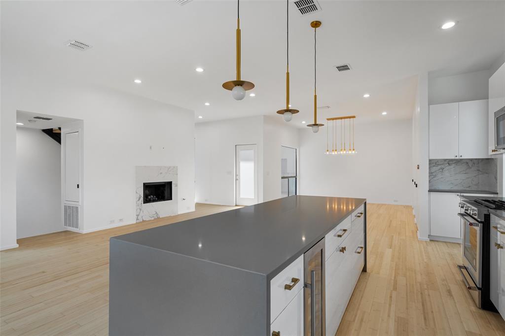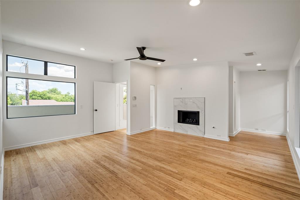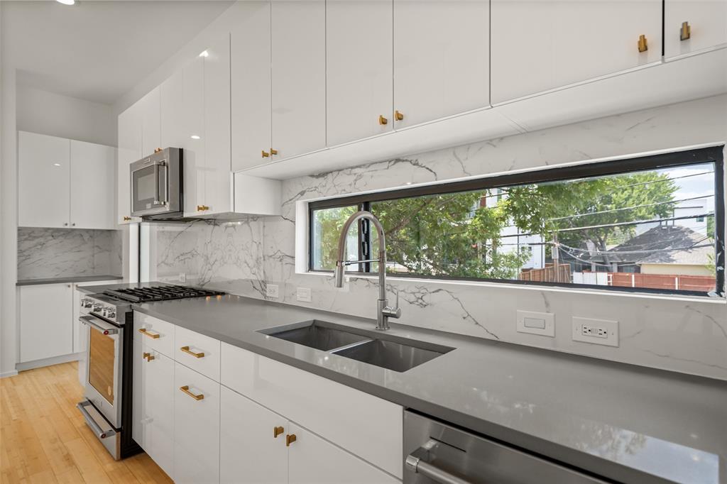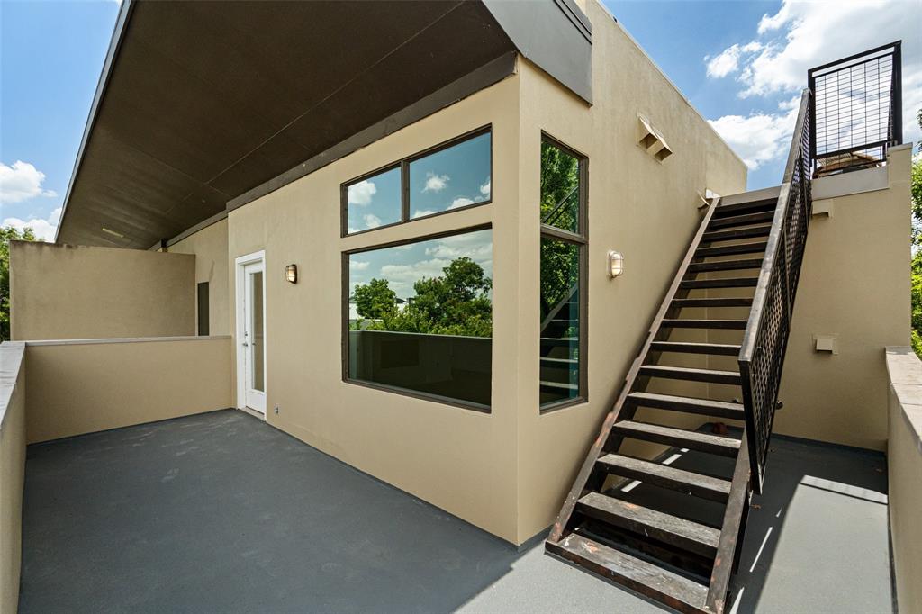 This stylish 3-story condo features an attached 2 car garage, multiple private outdoor spaces, and an open floor plan with a sleek design. Kitchen is equipped with stainless steel appliances, quartz countertops, oversized waterfall island, and thoughtfully laid out soft close cabinetry. Primary bedroom and guest bedroom are separated by the main living areas making it ideal for roommates or WFH space. Primary bedroom features an en suite, seating area to enjoy the fireplace, and oversized walk-in closet. Outdoor areas include a front courtyard, fenced in side yard, two balconies-off the living room and the primary bedroom, and a rooftop deck with stunning Downtown views. Washer-dryer hookups are featured in both bedrooms.