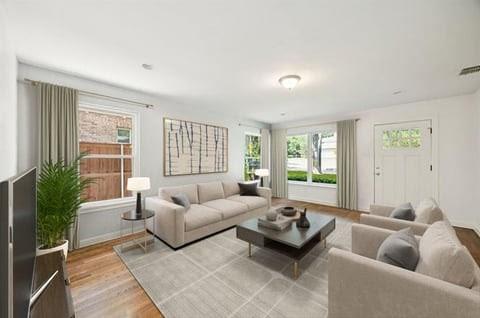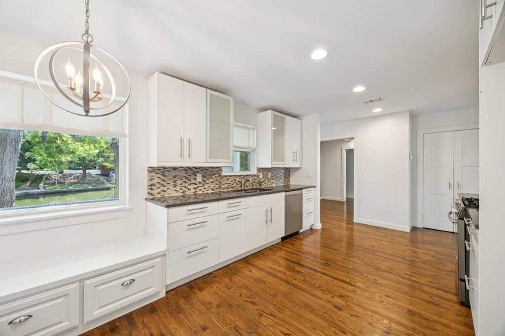 Exceptional location situated on a highly sought after waterfront, creek lot in the heart of Lakewood, home features updated KITCHEN, stainless appliances, granite counters, horizontal staggered tile backsplash, 4-burner gas cooktop, window above dual stainless sink, display cabinets w frosted glass, shelved pantry, wood floors, BREAKFAST w built-in banquette seating, storage drawers, custom shelving, decorative lighting, a FORMAL DINING with decorative chandelier, and wood floors adjacent to light-filled oversized LIVING at front of home with wood floors and multiple windows allowing abundance of natural light. PRIMARY ensuite at rear of home w decorative ceiling fan, wood floors, marble tile, floating vanity, dual sinks, walk-in tile surround shower w glass enclosure, and designer tile backsplash. Secondary BEDROOM w half BATH, walk-in closet and wood floors. Add'l BEDROOM suitable for office or flex room w space-saving pocket doors, shelved walk-in closet and wood floors. Full BATH in main hallway features tile bathtub, floating vanity, decorative lighting and full size Washer-Dryer area. Notable upgrades include windows replaced throughout, exterior doors w integrated adjustable mini-blinds, recessed lighting, recently painted interior, large backyard, sprinkler system, security system, side-entry garage, rear outdoor PATIO for entertaining, and wood dock at water's edge for launching boat, fishing or relaxing among towering trees in serene setting. Located just minutes from SoPac Recreational Hike & Bike Trail, Lakewood Park, White Rock Lake, Dallas Arboretum & Botanical Gardens, area shopping centers, dining, and convenient to downtown Dallas. A rare opportunity to invest in one of Lakewood's desirable neighborhoods!