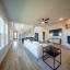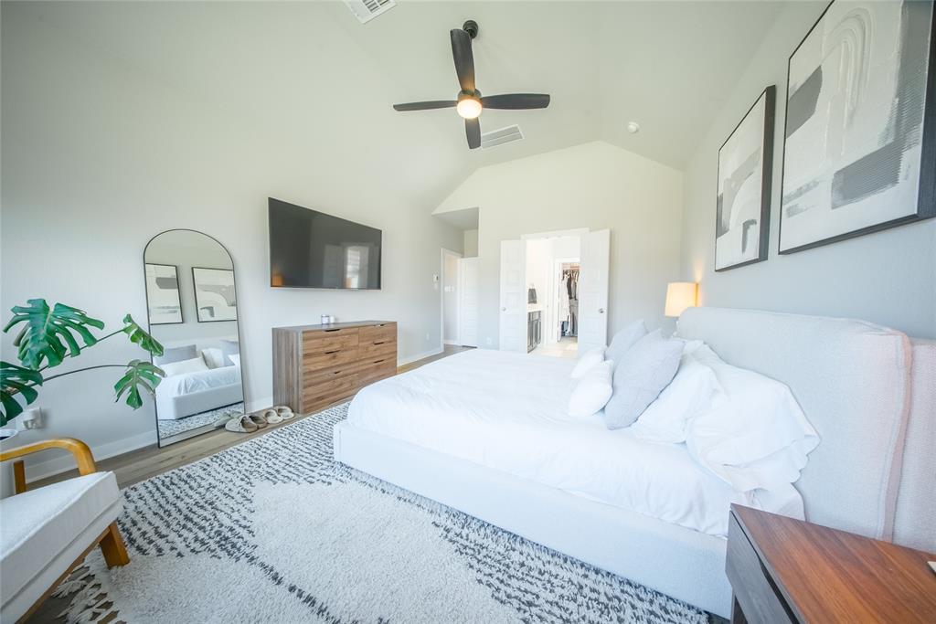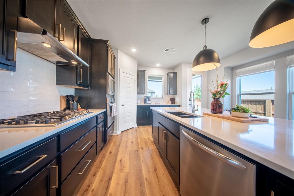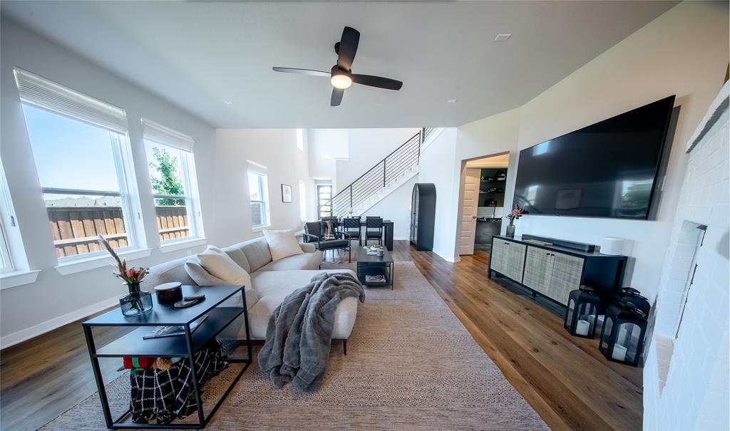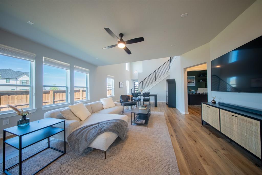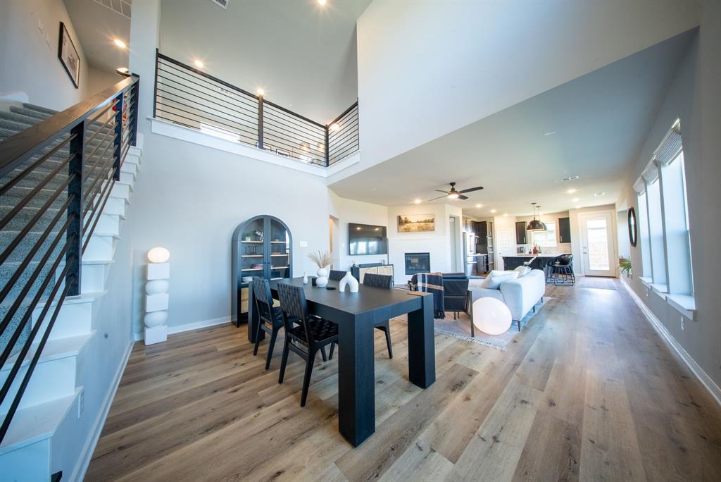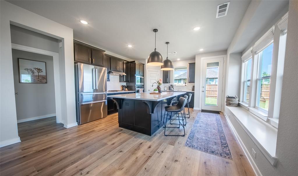 Step inside to an inviting open-concept floor plan with soaring ceilings, wood-look flooring, and abundant natural light. At the heart of the home, the chef-inspired kitchen shines with quartz countertops, stainless steel appliances, sleek cabinetry, and a large center island—perfect for casual dining or entertaining friends and family.