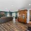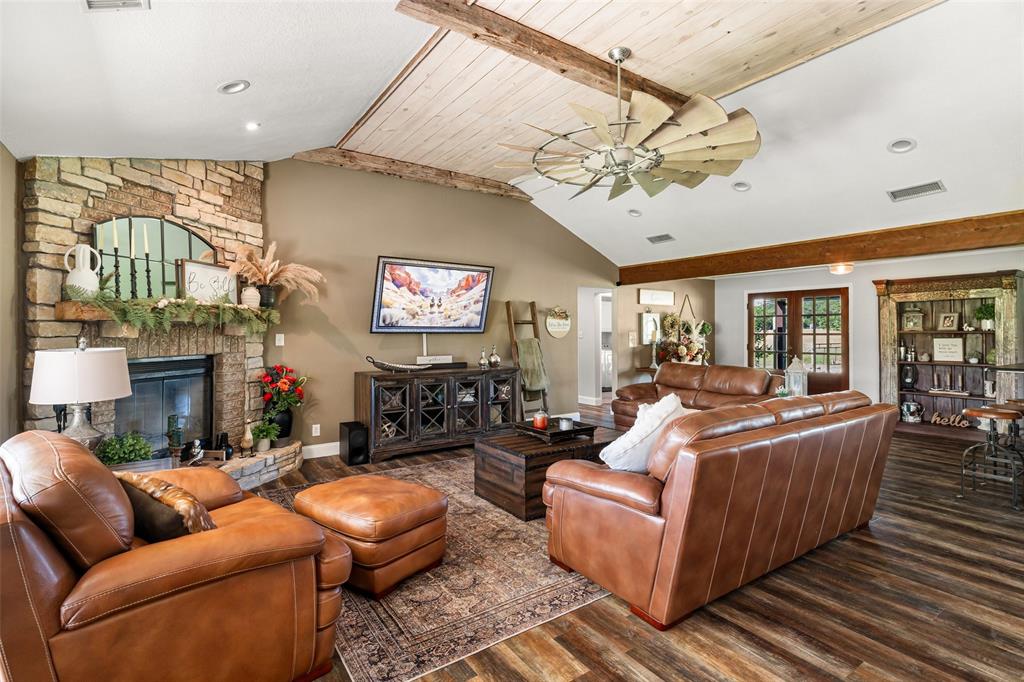 The home boasts an open-concept floor plan that flows seamlessly from the living room to the kitchen and dining area. The spacious living room features rich wood beams on a vaulted ceiling and a stunning stone fireplace, creating a cozy atmosphere. Large windows provide natural light and showcase the breathtaking views of the property.