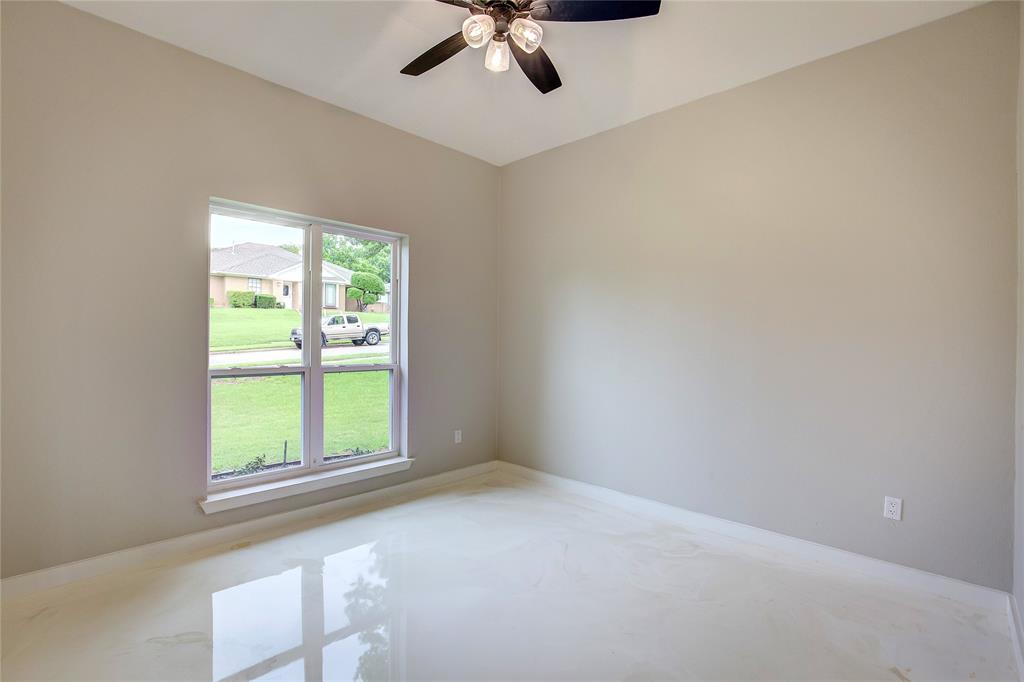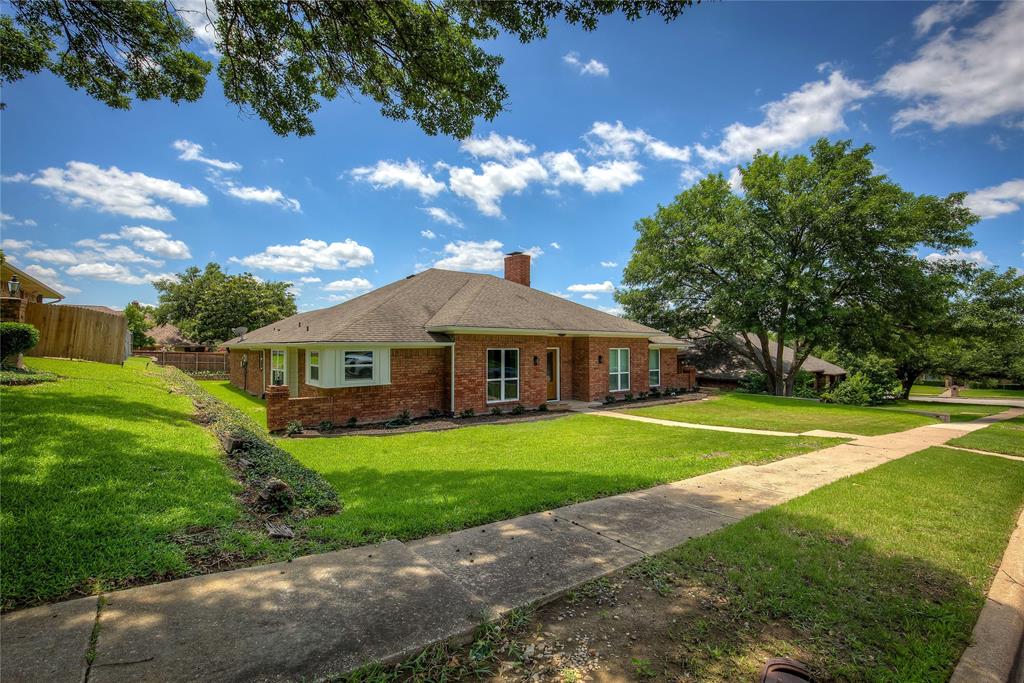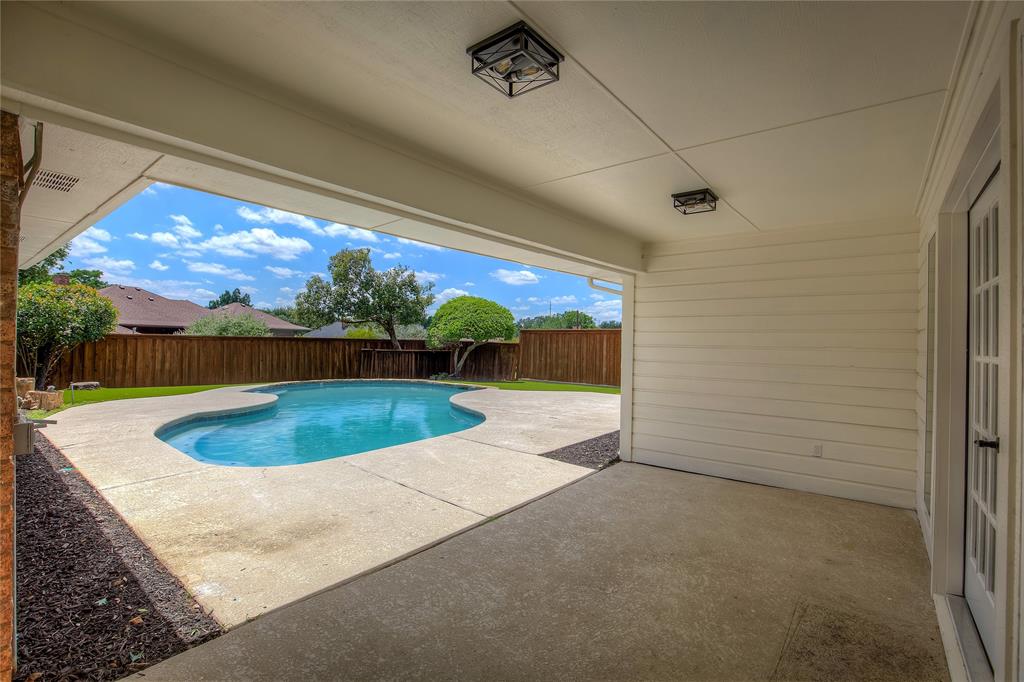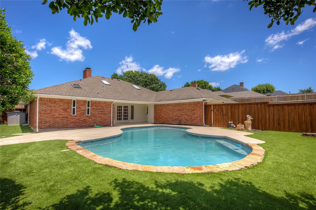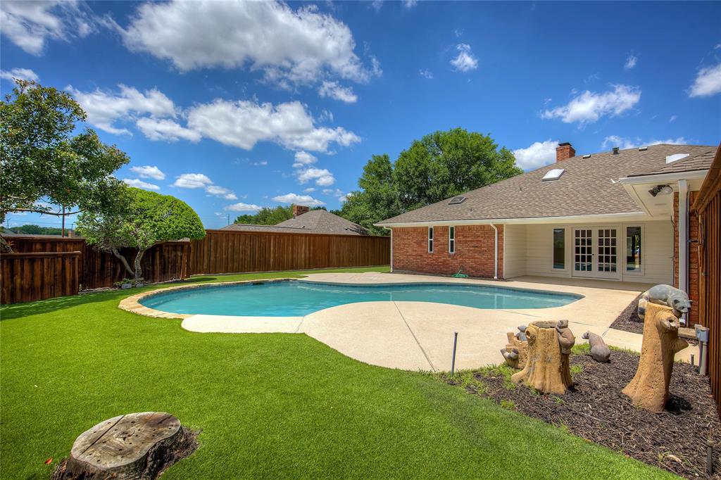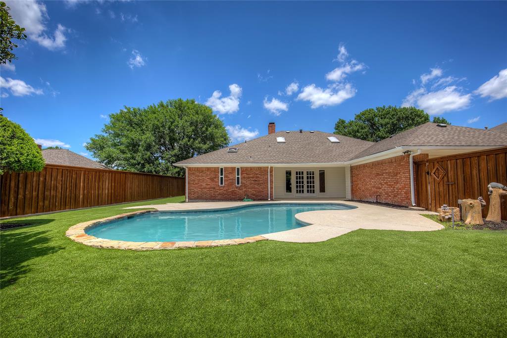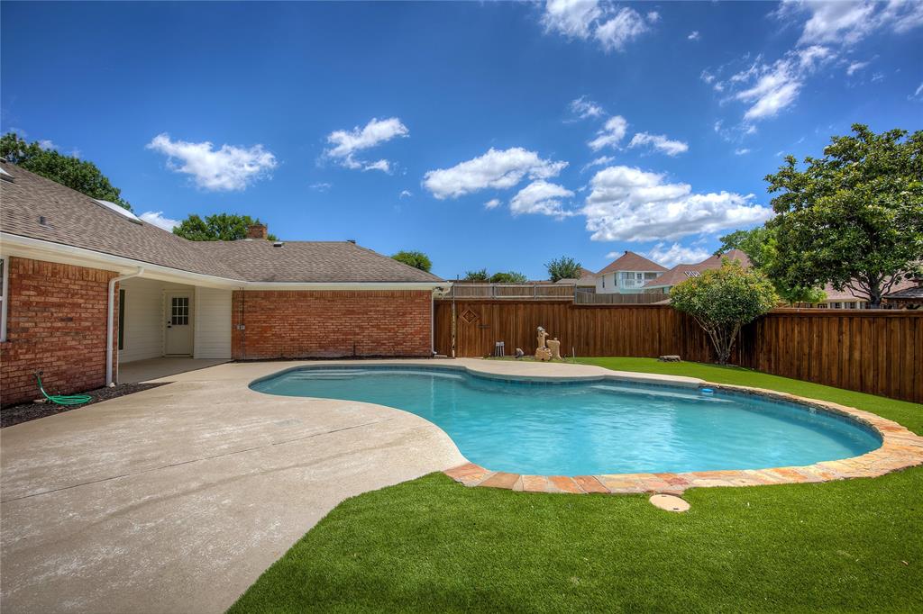 This move in ready gem offers comfort, efficiency, and a resort-style outdoor space all in a prime Garland location! This beautiful updated 4-Bedroom Home with Pool is combined with modern upgrades, comfort and functionality features, quartz countertops and backsplash in the kitchen, quartz countertops in all bathrooms, Stainless steel stove and microwave, epoxy flooring in the study and back bonus bedroom, New windows and screens for enhanced natural light and energy efficiency, Stylish black ceiling fans in all bedrooms, living room, and study, New cam lighting and updated light fixtures inside and out. Waterproof laminate plank flooring in common areas and new carpet in 3 bedrooms, Two car garage with low maintenance artificial grass in the backyard, Full washer and dryer included, with gas hookup for dryer, Gas water heater, gas fireplace, electric HVAC unit, and gas furnace, working sprinkler system in front and sides of the home.