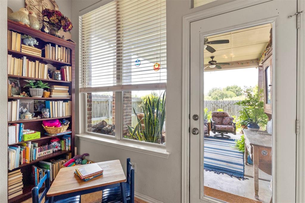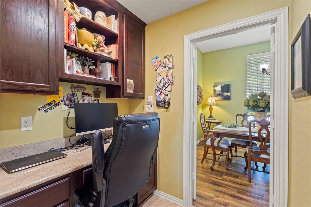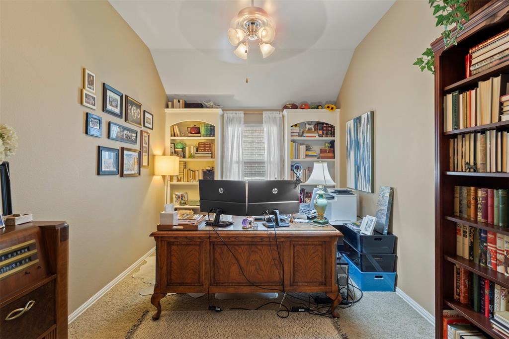 Work or study in style in the dedicated office, complete with elegant French doors and custom built-in bookshelves for added functionality and charm.