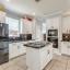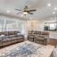 The chef’s kitchen is a true highlight with expansive counters, double ovens, smart under-cabinet lighting, a center island, and a decorative stone breakfast bar. It opens seamlessly into the spacious living room, anchored by a stone fireplace that invites gatherings and cozy evenings.