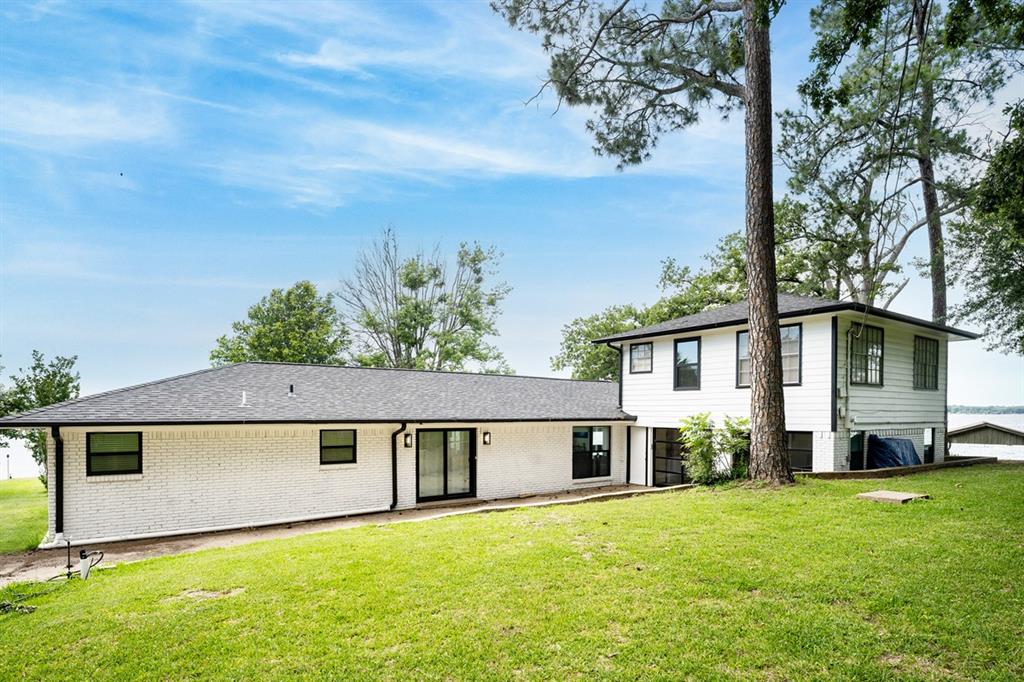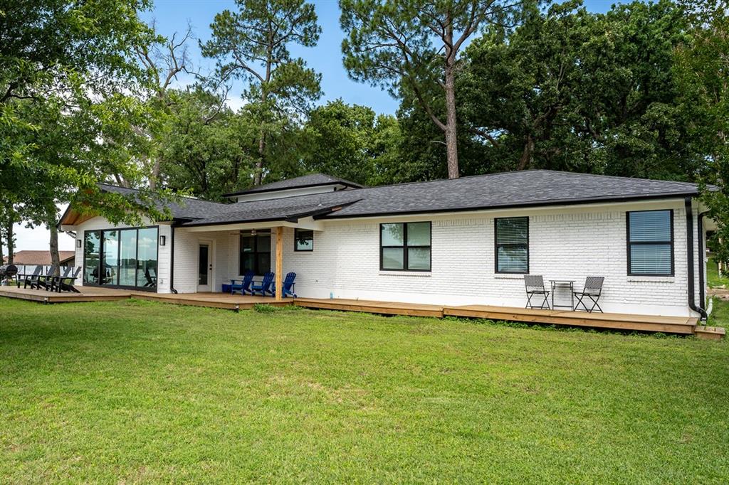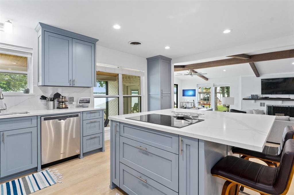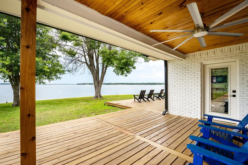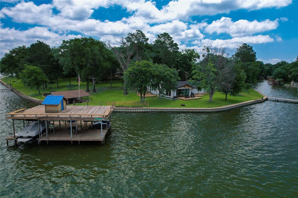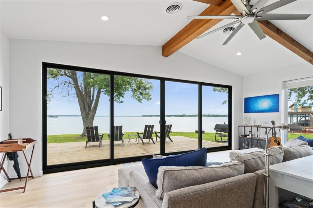 Exceptional water depth sets this home apart! Over 11' depth at the dock of this peninsula point with over 200ft. of private shoreline. Stepping into this beautifully updated home and you are met by miles of pristine open water views. Surrounded by the freshest finishes throughout this stunning open design. Wood beam ceilings span the vaulted living space, wbfp centering the room where double sliding doors bookcase to all of the outdoor fun to be had. Kitchen boasts stainless appliances including double oven for ease of entertaining and hosting the largest family gatherings. Master suite and spacious guest suite main level both appreciate windows flooded with natural light and lake views! Two bunk rooms and a third bath upstairs over the game room; second living space on a second heating and cooling zone. HVAC, water heater, appliances, cabinetry, fixtures, windows and standing seam metal roof all 2019 or newer. VRBO Allowed. Fire pit and mature trees at water's edge.