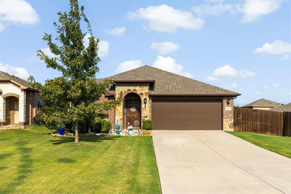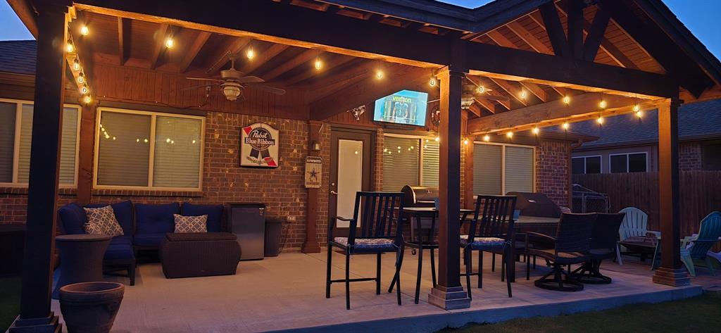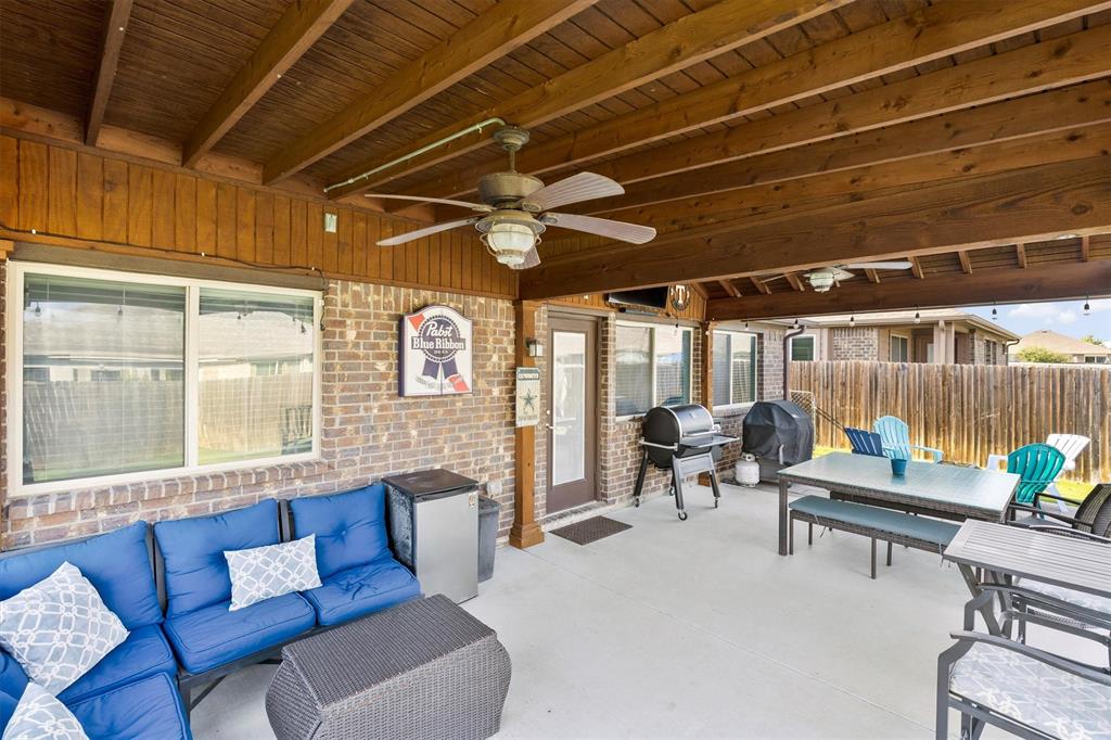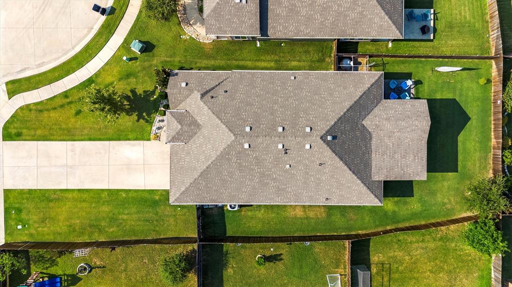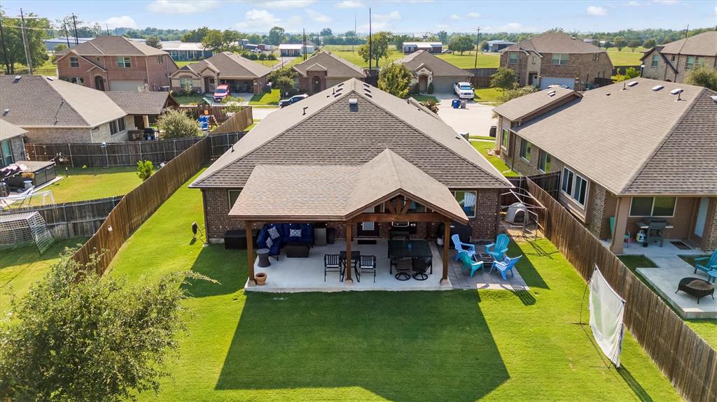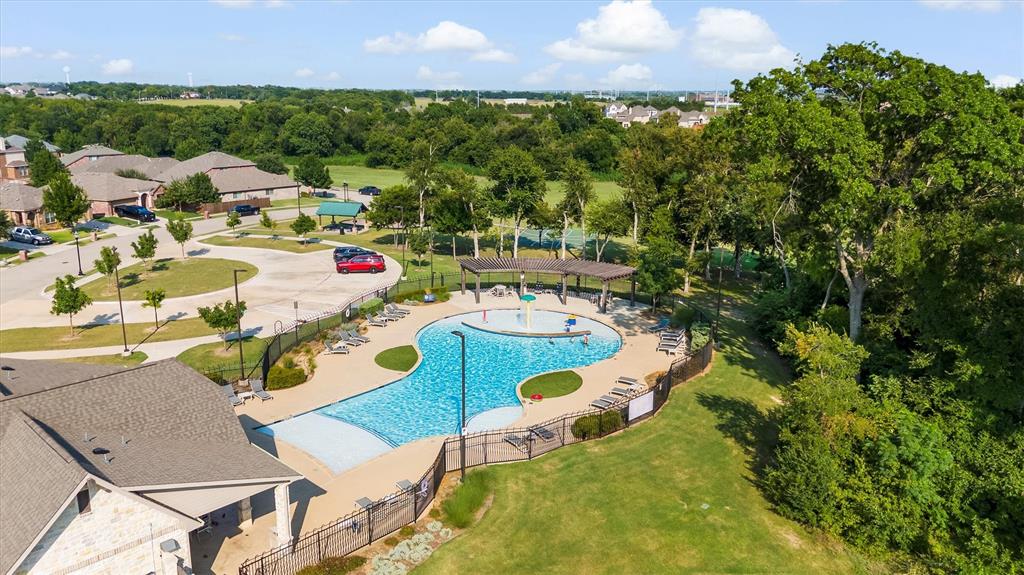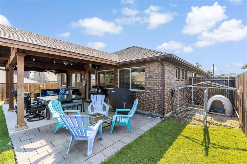 LARGE LOT WITH CUSTOM COVERED PATIO! Must-See Home with Backyard Retreat on Cul-de-Sac Lot! Welcome to this beautifully maintained brick and stone home, ideally situated on a spacious 0.218-acre cul-de-sac lot in a thriving community within sought-after Community ISD—home of the Braves! Enjoy your own outdoor oasis with a EAST-facing extended covered patio, perfect for evening entertaining Outfitted with charming twinkle lights, a mounted outdoor TV, and a cozy fire pit area, it’s the ultimate game day or relaxation spot. The oversized driveway accommodates up to 8 cars—ideal for guests or multi-vehicle households. Step inside to an inviting open-concept floorplan featuring a gourmet kitchen with granite countertops, upgraded tile backsplash, modern cabinetry, commercial-grade vent hood, stainless steel appliances, and a spacious walk-in pantry. The kitchen island provides plenty of seating and seamlessly flows into the bright and airy living room, which easily fits large furniture and is filled with natural light.The expansive primary suite offers enough space for a private sitting area, along with a large walk-in closet, dual vanities,and a luxurious oversized walk-in shower. The three additional bedrooms are equally charming—one of which makes a perfect home office or guest room. Additional features include a full sprinkler system, separate fenced dog pen in backyard, a separate laundry room with drip dry pole, rain gutters, and thoughtful upgrades throughout. Enjoy access to top-tier neighborhood amenities including a 300-gallon resort-style pool, additional pools, fitness center, playgrounds, and more!
