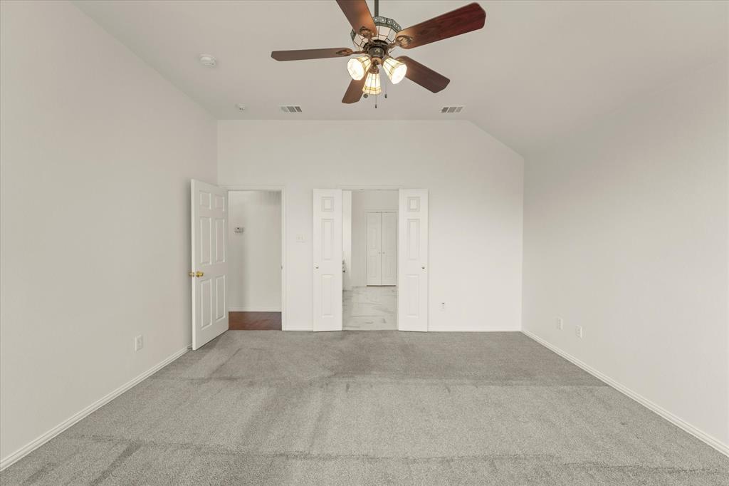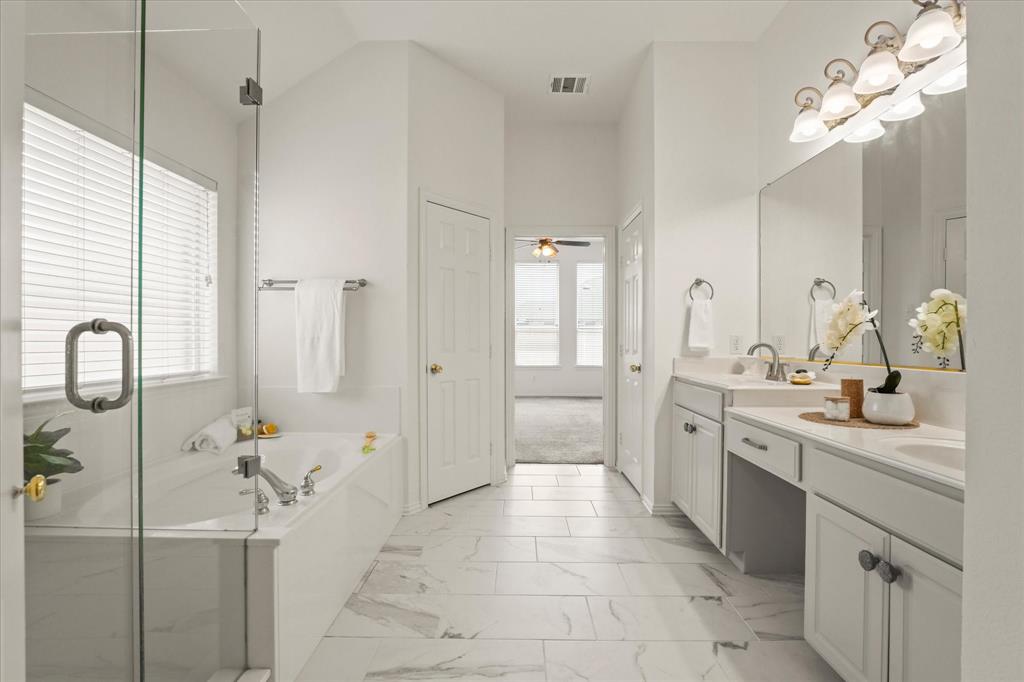 The updated primary suite features a spa-like bath with marble countertops, dual sinks, garden tub, separate shower, and a massive walk-in closet. 2 of the 3 secondary bedrooms also include large walk-in closets. The soaring ceilings throughout give an open, airy, and spacious feeling.