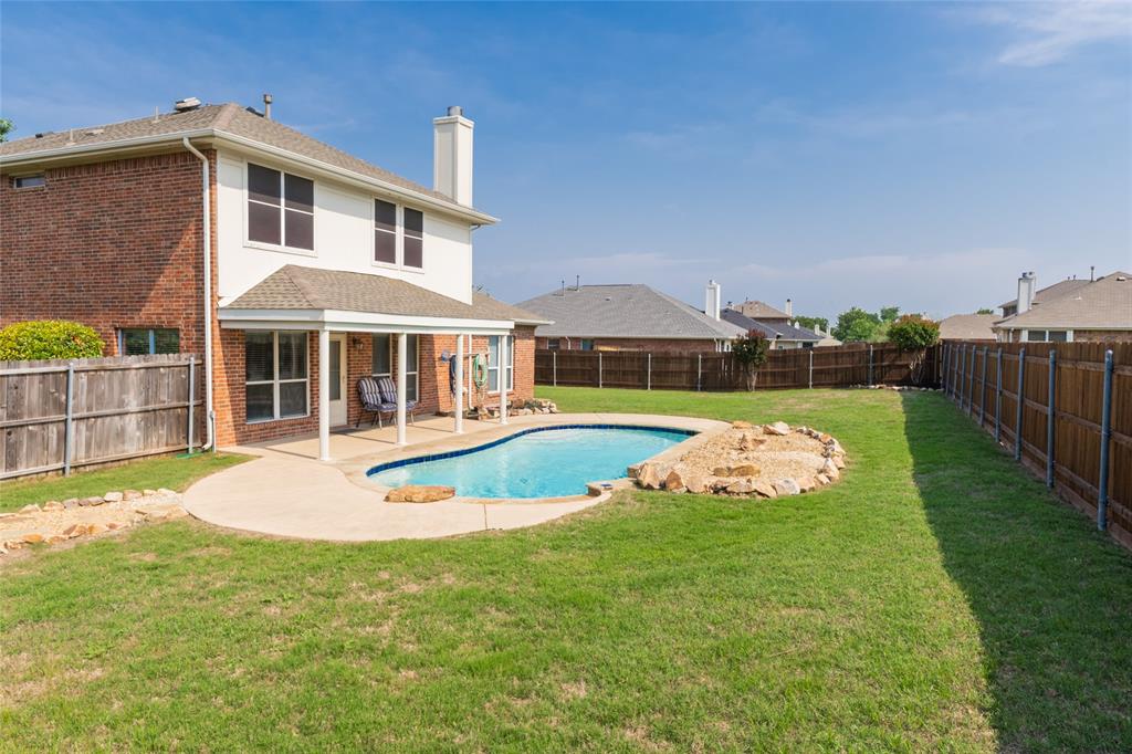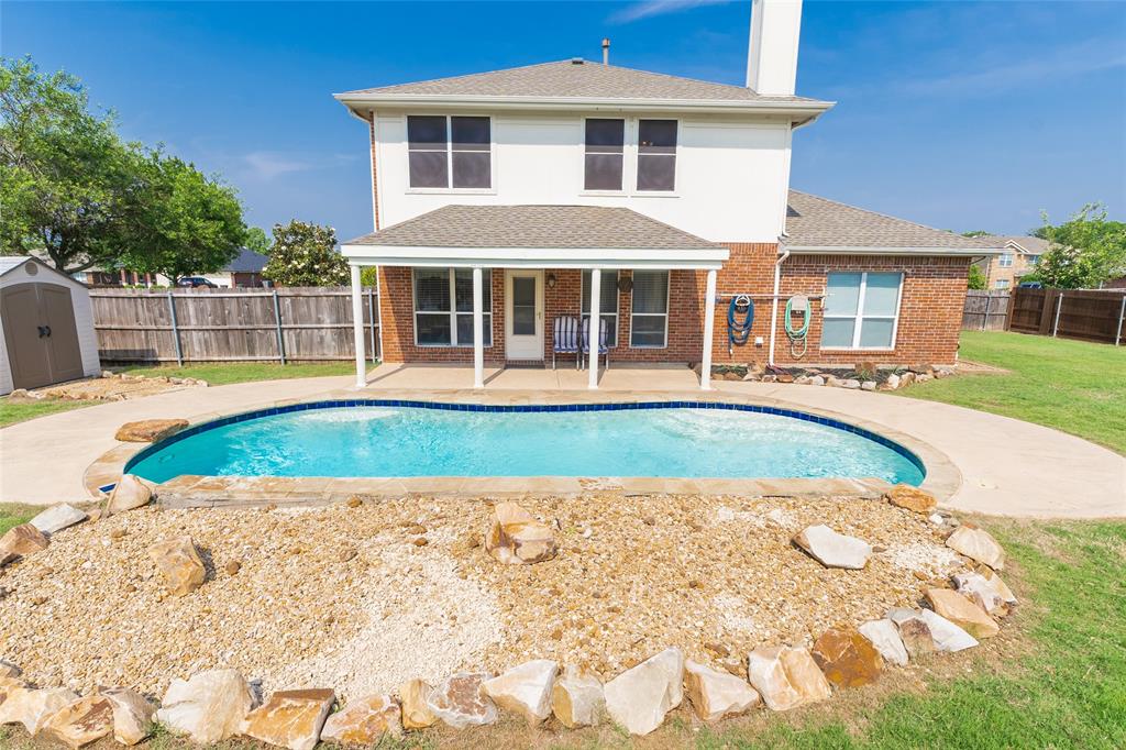 Step outside to your own private retreat featuring a sparkling in-ground pool with a diving rock and cool deck, perfect for cooling off during those hot Texas summers, a stationary patio cover for shade, a storage shed on a concrete slab, and a brand-new fence enclosing the backyard.