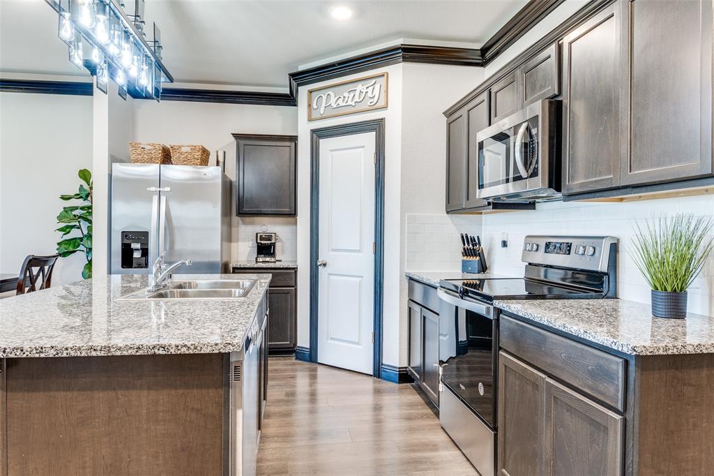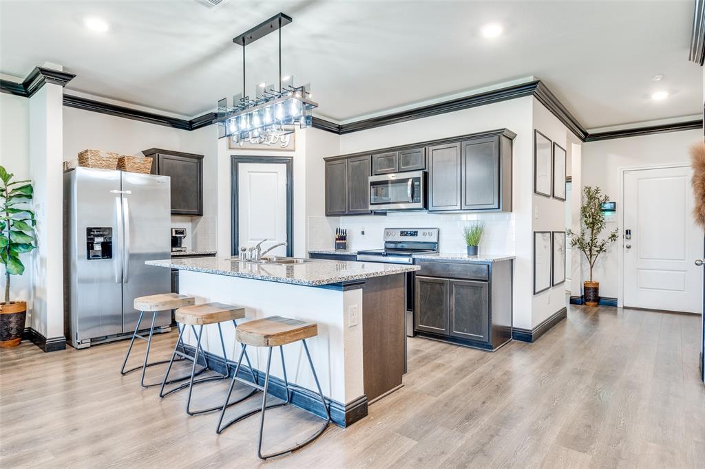 Welcome to this beautiful two-story home on a desirable corner lot, offering a flexible floor plan with 2 bedrooms downstairs—including the spacious primary suite—and 2 additional bedrooms upstairs. The open-concept layout connects the living room, kitchen, and breakfast area, creating an inviting space for entertaining or everyday living. The kitchen features a center island with eat-in seating, perfect for casual meals and gatherings. Crown molding and 5.5-inch baseboards enhance the elegance of all common areas.